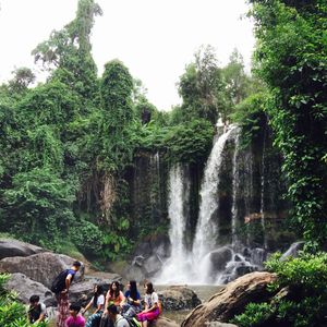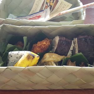 山に登るのにピックアップトラックかバイクか選べます。我々はトラックを選び荷台に乗り込みました。風が気持ちよかったです。山腹に着いてまずはお昼ごはん。小さなレストランが並んでおり、そのうちの一軒に入りガイドさんが持ってきてくれたお弁当を食べました。おにぎりとクメール料理風のおかず。おいしかったです。飲み物は持ってきてましたが一人一本頼むように言われました。そりゃそうですよね。