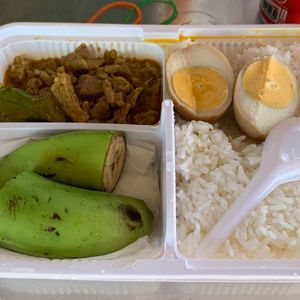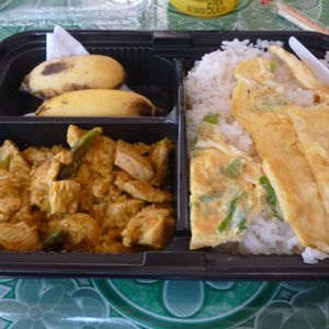 ランチボックスは、ネギ入り卵焼きがご飯の上にのっていて、唐辛子入り豚肉とショウガの炒め物とバナナが入っていました。味は普通です。