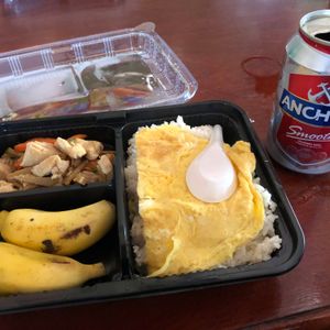 昼のお弁当はショウガ味の鶏肉の炒め物と玉子焼きの乗ったご飯とバナナのデザート付きでとても美味しかったです。