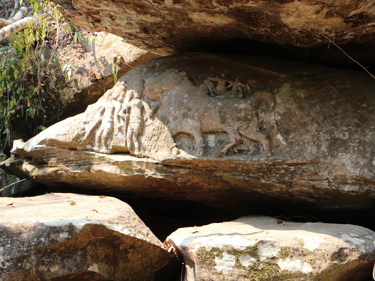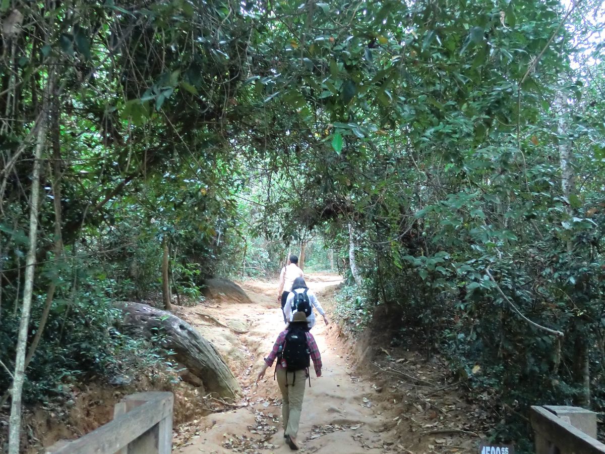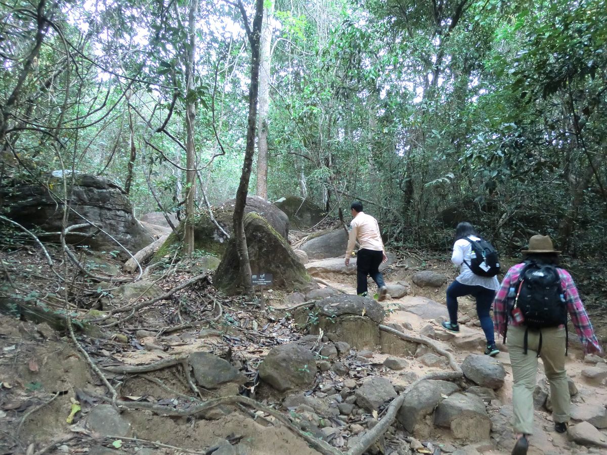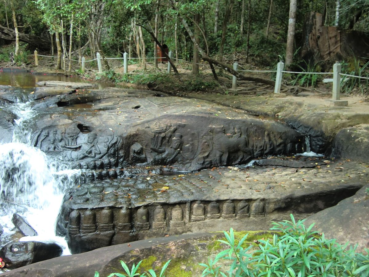 クバールスピアンは足場の悪い岩場や砂道のある山道を約1.5km登っていきます。お年寄りも頑張ってゆっくりと登られております。上り詰めたところの川が流れる岩場に彫刻があり、こんなところによくも彫ったものだと感動しました。足はかなり疲れますが、後の感動で疲れは吹っ飛びます。