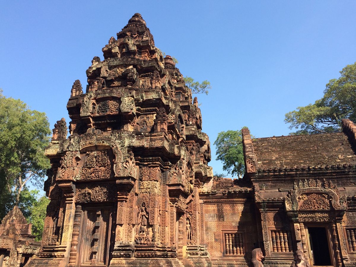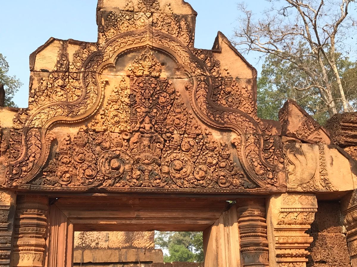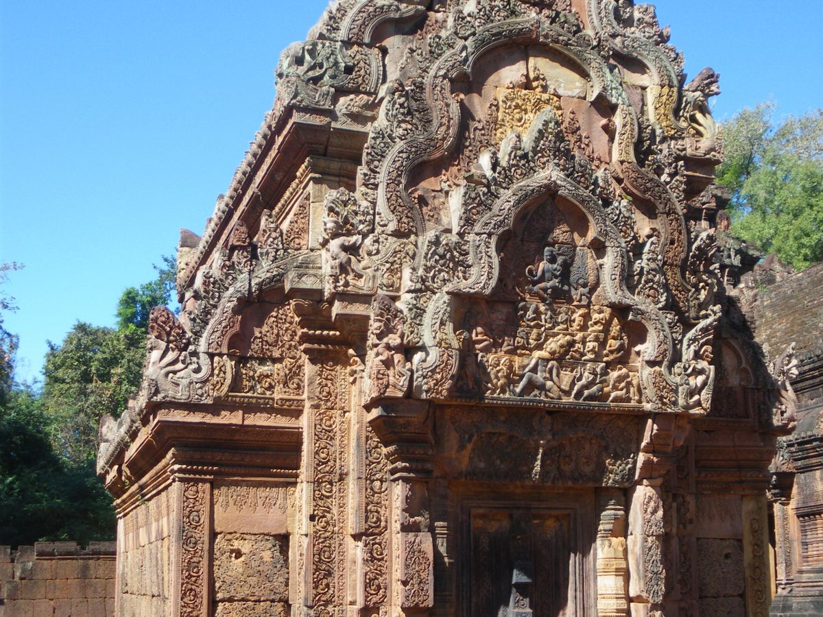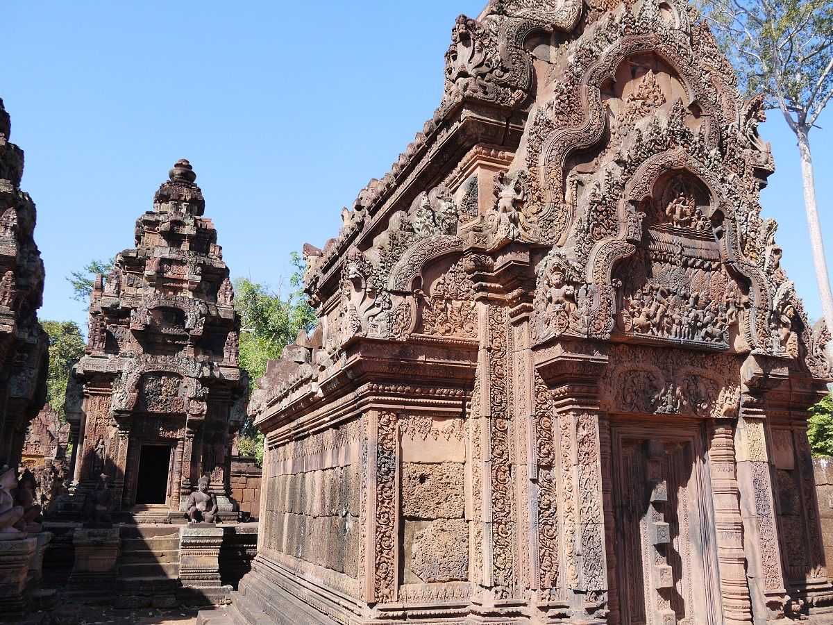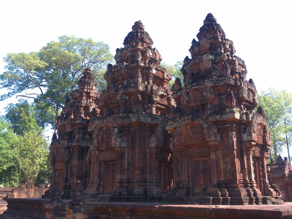 バンテアイスレイは赤い砂岩で建造されたこじんまりとした、ヒンドゥー教寺院遺跡で塔門や祠堂の全面が彫刻で飾られていて美しくて、品がある寺院と感じました。