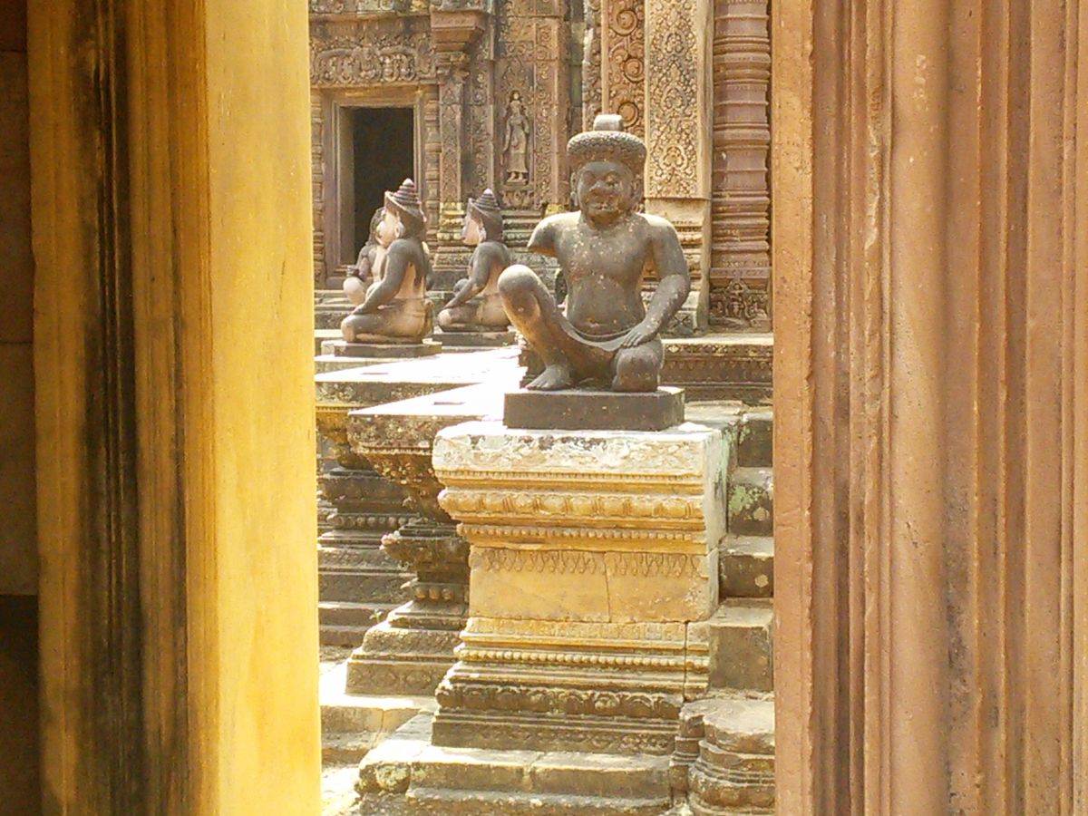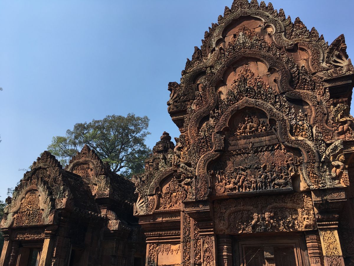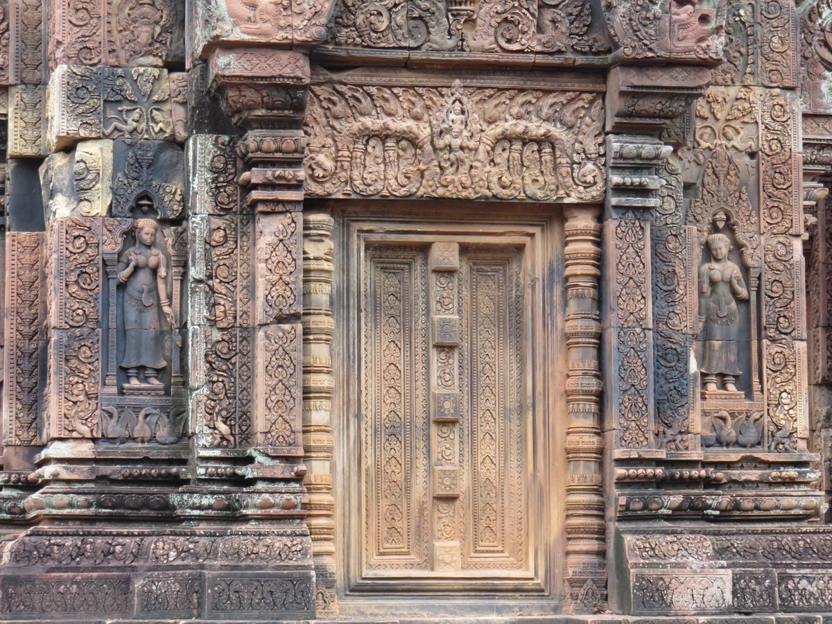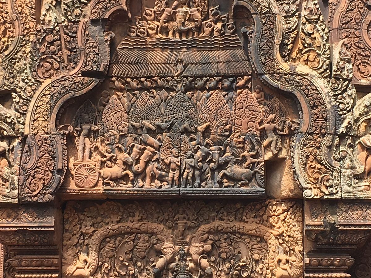 バンテアイスレイは赤い砂岩で建造されたこじんまりとした、ヒンドゥー教寺院遺跡で塔門や祠堂の全面が彫刻で飾られていて美しくて、品がある寺院と感じました。