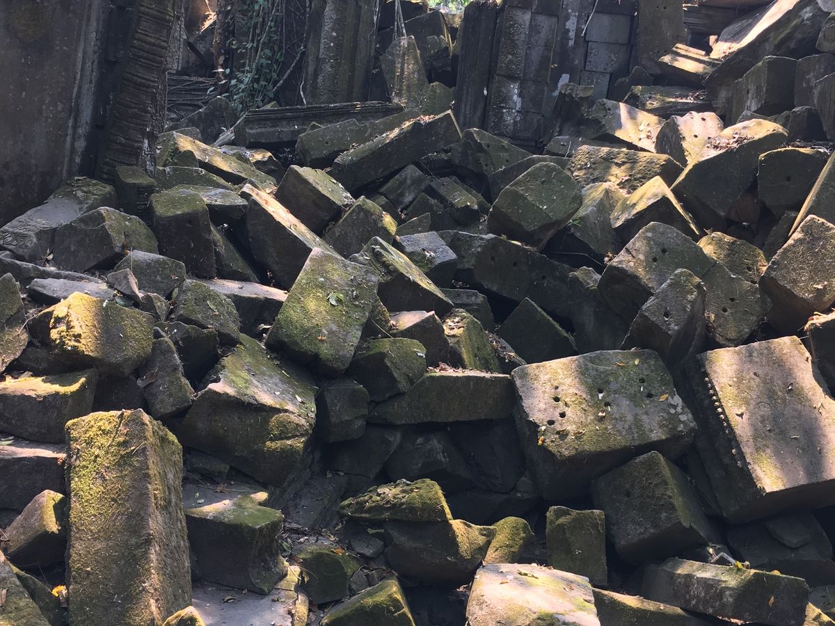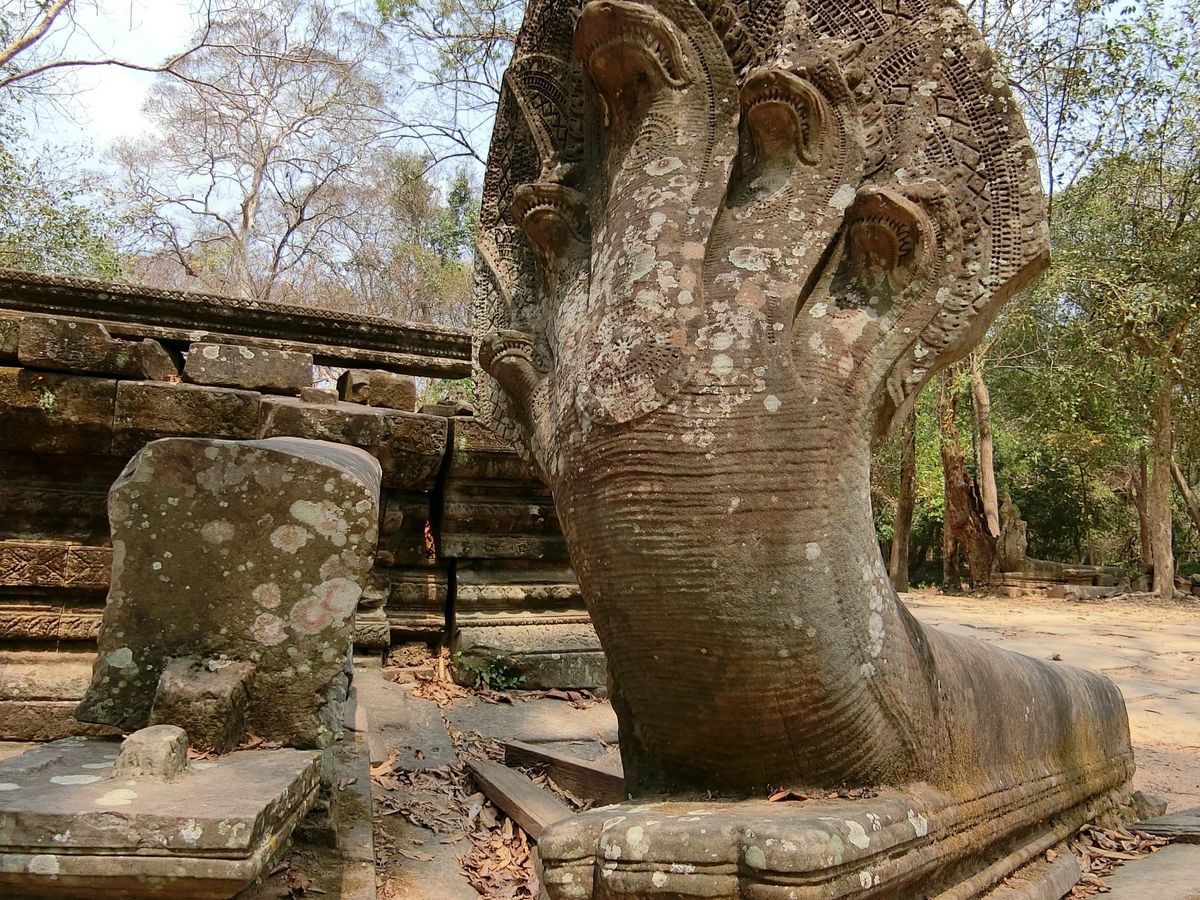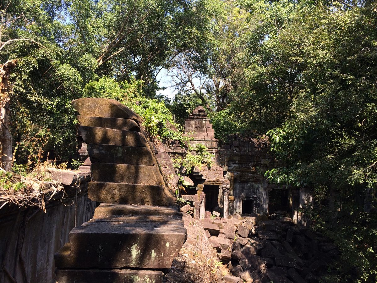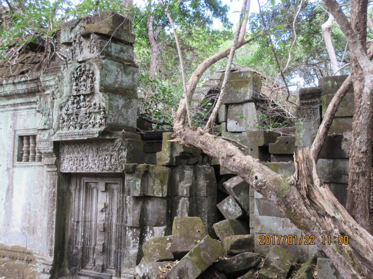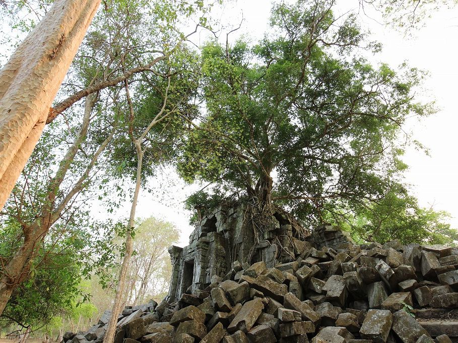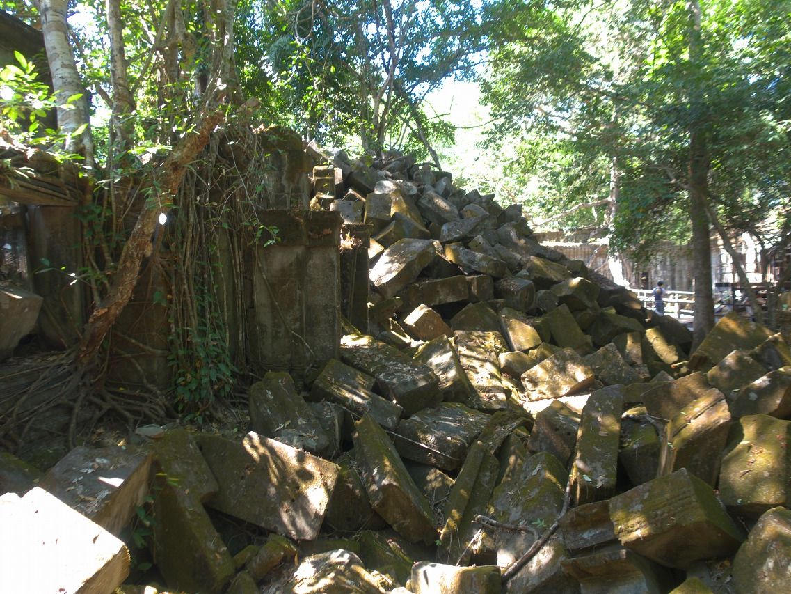11時、次の訪問地ベンメリア寺院遺跡へ40分、ベンメリア寺院は1090-1120年ごろ建造されたヒンズー教の寺院、第一印象は壊れ方がひど過ぎる。ほとんど原形をとどめていない。地震でもなければここまで壊れないだろうと思う、ガイドさんによればカンボジアは地震がないという。過去の戦争やポル・ポトによる人為的な破壊を感じさせる。唯一ナーガと呼ばれる蛇神像はきれいに残っているのが不思議な気がしました。