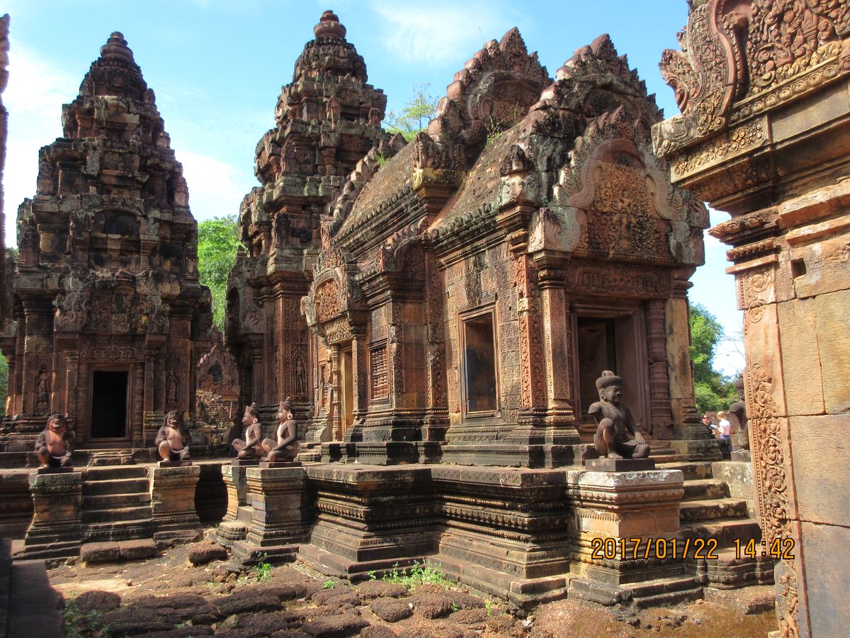 アンコールワットから車で1時間位の所にあり、少し離れているのであまり混雑はしていませんでした。バンテアスレイはすべてがとてもきれいに残っており、1つ1つの彫刻がとても美しいかったです。また、ベンメリアは人の手があまり入っていない為、崩れた所はそのままの姿を見ることができ、様々な謎が感じられます。また、昼食は途中のレストランでカンボジア料理を食べましたが、あまり辛くなく美味しかったです。