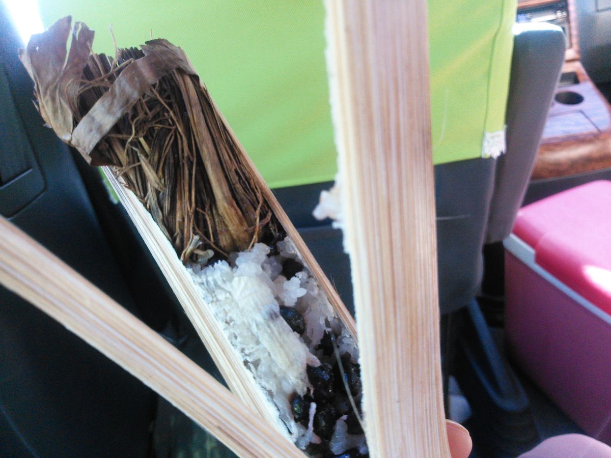 目的地に行く車中、カンボジアのお酒やお菓子について質問したところ、日本でいうとおはぎ、もしくは甘いお赤飯のようなおやつを買う為に、車をとめてくださいました。(道端でお姉さんが屋根もない所で商売していて^^)カンボジアでしか味わうことのできない珍しいおやつを戴くことが出来ました。