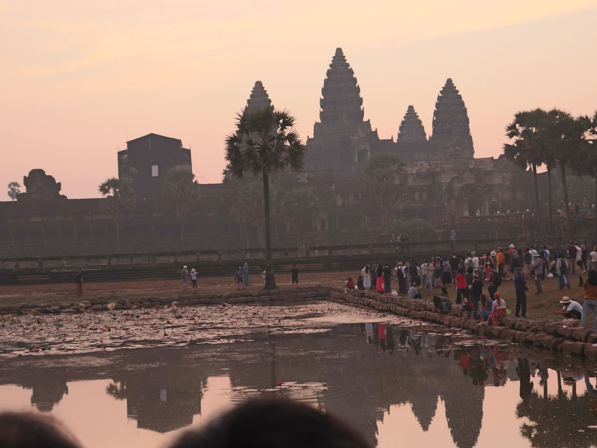 アンコールワットに到着した時は、暗くて何も見えませんでしたが、朝日が登る時刻になってきてだんだん明るくなり、多くのの環境客がいるのにおどろきました、。