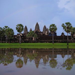 天候は朝から昼過ぎまでは晴れで文句なし、夕方は一転スコールになりましたが、短時間で終わりました。なんと、そのお陰でアンコールワットに虹がかかるところも観れました。
