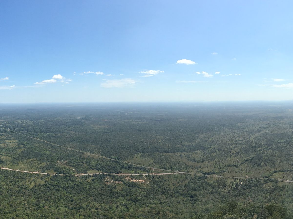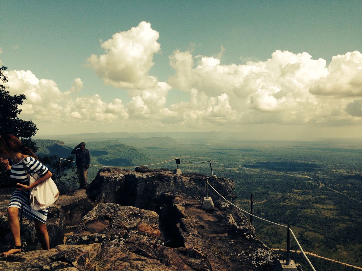 アンコールワットからは北東250km、タイとの国境付近に位置していている世界遺産です。車に揺られて片道3〜4時間かかりましたが、日本では見られない広大な自然の土地の広さと変わりゆく南国の景色、町並みの風景を見ながらの移動だったので、あっという間に着きました。心配していたトイレでしたが、ガイドさんの機転で綺麗なトイレを案内してくれたので良かったです。暫く平坦な道を進んでいきましたが、途中から4WDに乗り換え急勾配な坂道を登って行きました。さて、プレアヴィヒアですが、迷彩服を着た人もいましたが家族で遊びに来ている現地の方もいて穏やかな雰囲気でした。山を散策しながら15分ほど歩くと寺院が見えてきました。観光客の多くは日本人だったのでのんびりと見る事が出来ました。寺院を観光しながら絶景の見える場所は⁇と気になりながら観光しましたが、寺院を抜けると素晴らしい景色が目の前に広がりました。特に山の崖の上から眺める景色は最高でした‼︎アンコールワットと共通する部分もあり繋がりを感じられる遺跡群でした。またカンボジア旅行へ行った時には時間を作ってでも訪れたい場所です。