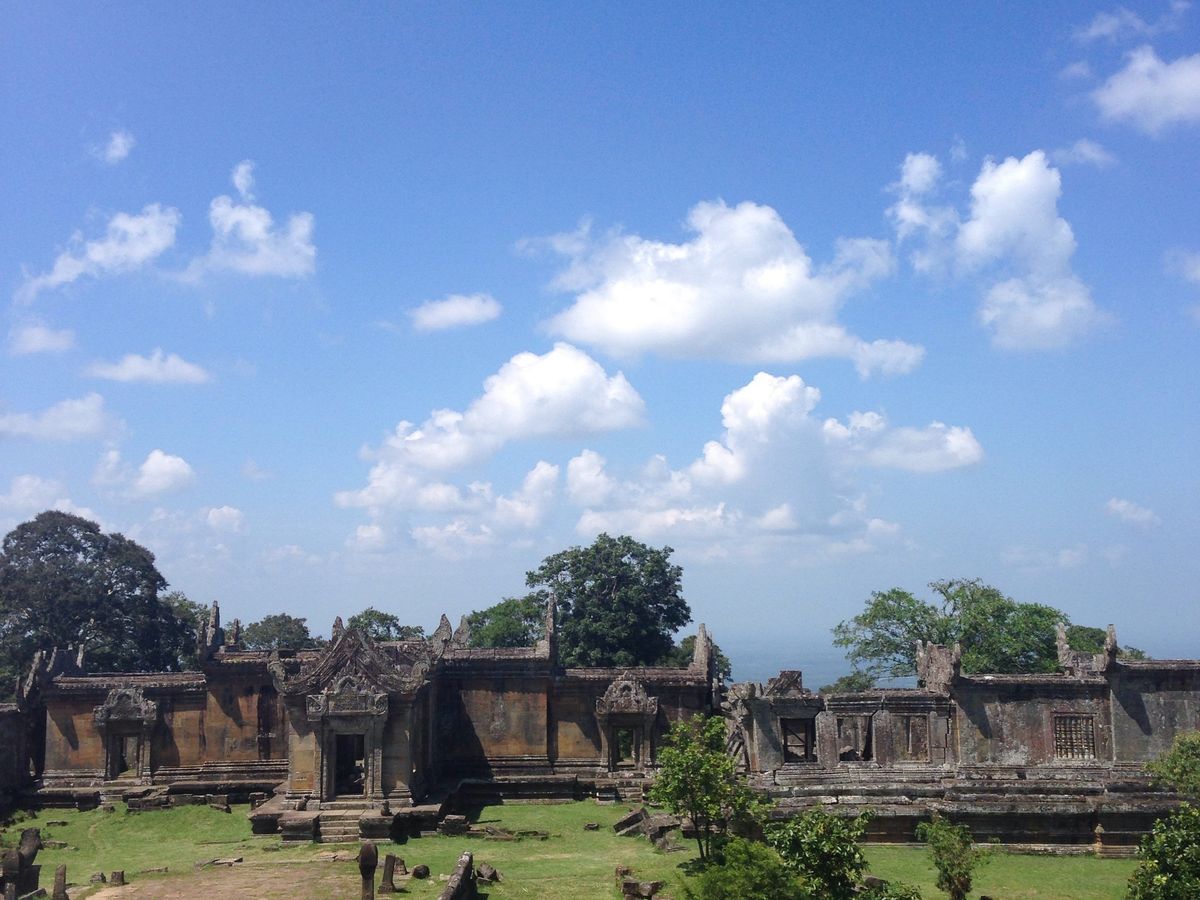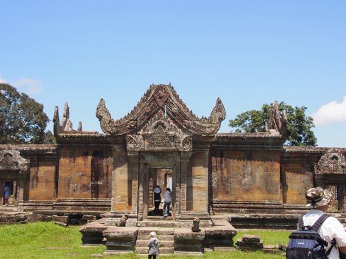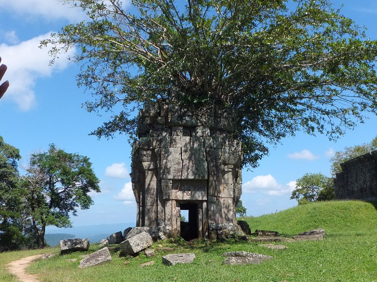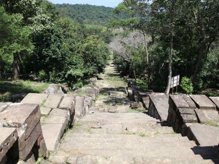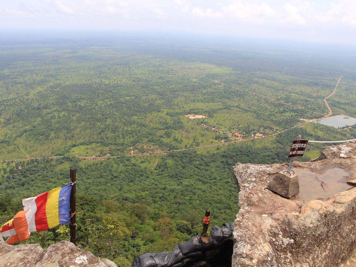 にもなっています。ぐるっと回って角度を見極める必要があります。第2塔門のレリーフはとても綺麗に残っていました。山道には、戦闘でついた、爆弾の後がついています。山頂を目指しながら後ろを振り返ると、タイ寺院が見えます。(ガイドさんがいないとこの辺がわからないポイント)山頂に着く前にもいろいろなビューポイントがありますので、登ることに集中しないで、ゆっくり周りを楽しむ必要がありますね。しかしながら、山頂からの眺めは、最高です。見渡す限りの絶景。風が気持ちよく吹いていて最高の気分です。昼食は、下山してからお弁当をいただきましたが、前日もVELTRAのツアーに参加していたため、全く同じ内容のお弁当でしたので、ガイドさんにお願いして、現地の食堂で、ヌードルとビールをいただきました。1日かけてこのツアーに参加して、大満足でした。