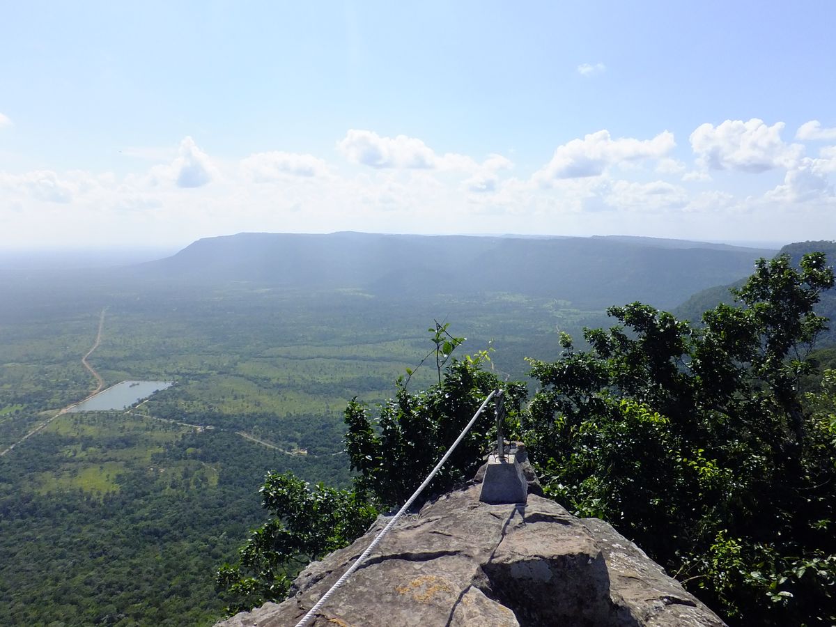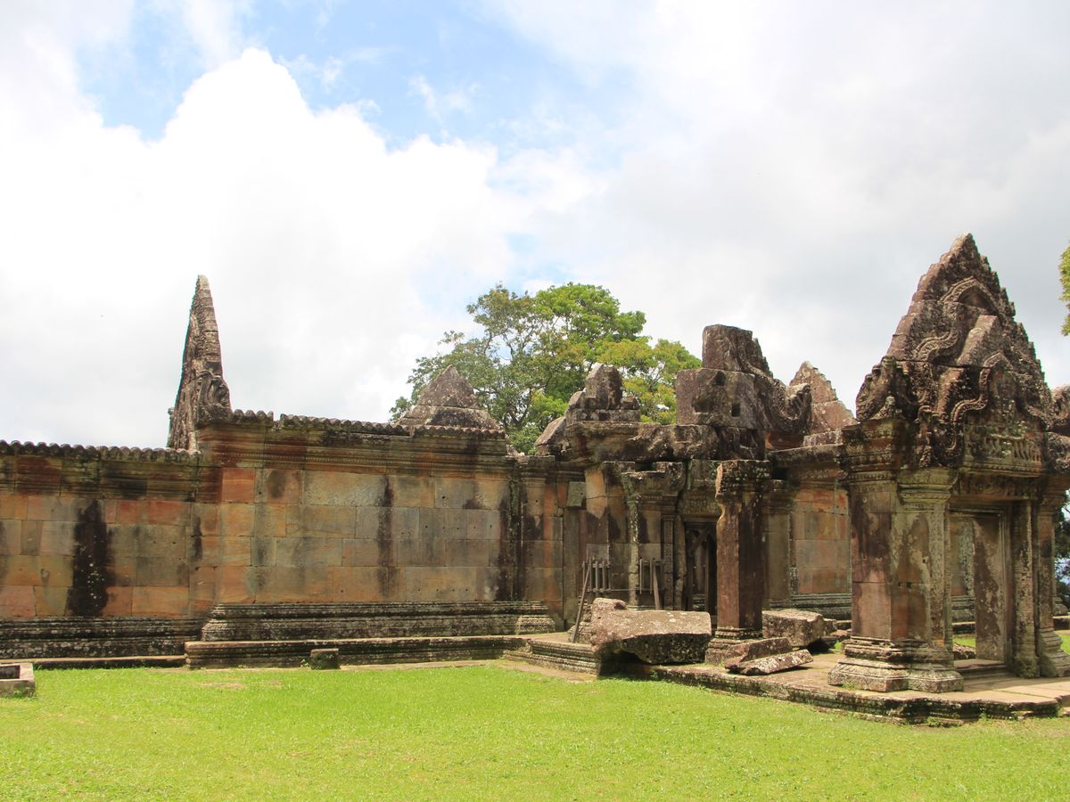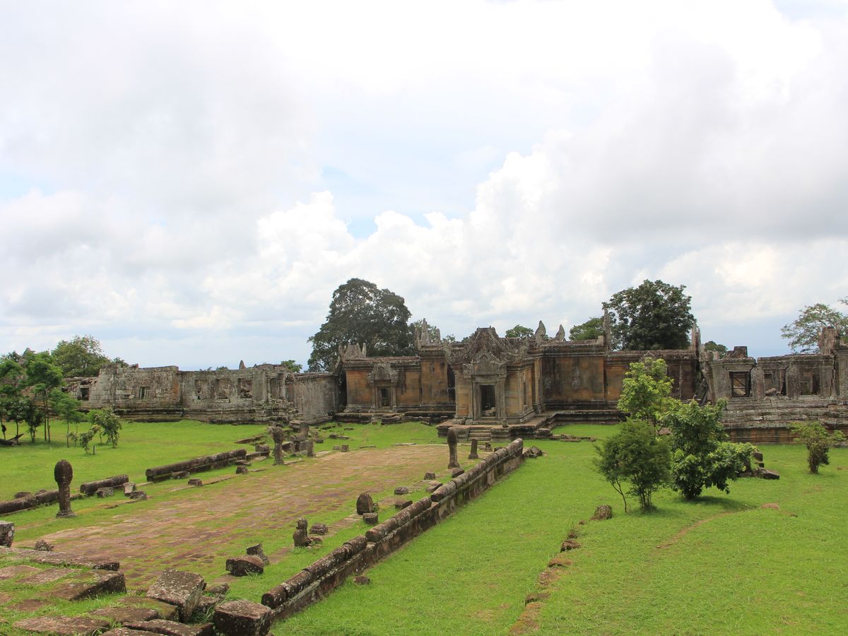 にもなっています。ぐるっと回って角度を見極める必要があります。第2塔門のレリーフはとても綺麗に残っていました。山道には、戦闘でついた、爆弾の後がついています。山頂を目指しながら後ろを振り返ると、タイ寺院が見えます。(ガイドさんがいないとこの辺がわからないポイント)山頂に着く前にもいろいろなビューポイントがありますので、登ることに集中しないで、ゆっくり周りを楽しむ必要がありますね。しかしながら、山頂からの眺めは、最高です。見渡す限りの絶景。風が気持ちよく吹いていて最高の気分です。昼食は、下山してからお弁当をいただきましたが、前日もVELTRAのツアーに参加していたため、全く同じ内容のお弁当でしたので、ガイドさんにお願いして、現地の食堂で、ヌードルとビールをいただきました。1日かけてこのツアーに参加して、大満足でした。