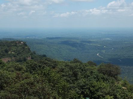 道中はカンボジアの生活の姿を眺めながら、プレアヴィヒア観光の出発地点に到着します。受付で、観光チケット、車の手配を済ませ、いざ乗車(トヨタの4WDトラックの荷台ですが)デコボコの急勾配の道を登ります。この時は体をキープするのが大変でした。車を降りるとそこはもう天空の遺跡の入口です。以前の入口であったタイ国境の山道を上から眺め、なだらかな山道を登ります、ピラミッッド型遺跡ですが、山腹のため、穏やかです。第一塔門はお札のデザイン