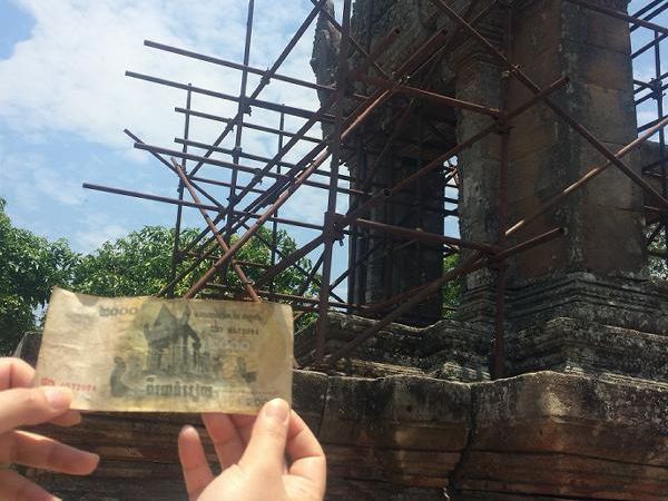 この遺跡は 2,000リエル札にも印刷されています。こうしてお札と建物を一緒に撮ってみました。そして、今はタイとの紛争は収まっていますが、有事のときはいつでも戦闘に入れるように純を持った軍人さんが大勢警備についています。家族の方も一緒に暮らしています。