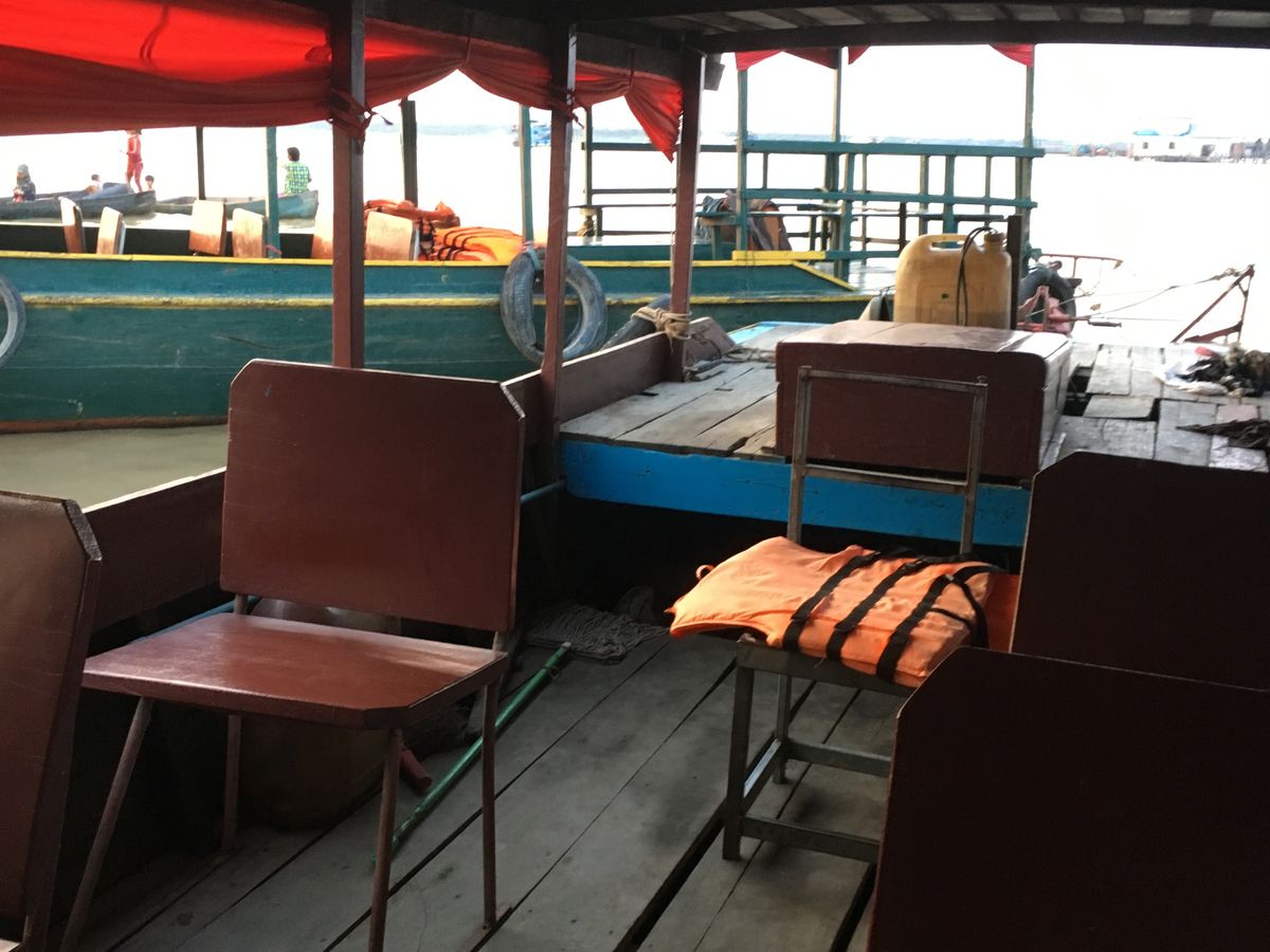 それからトンレサップ湖へ向かいました。船に乗りましたが、9人いるのに、船のイスは8人分。出発しかけて気づいて、船を大きいのに変えるのかと思ったら、ものすごい古い木製のイスが投入されて、1人参加のお兄さんが座ってくれました。固定されているわけでもないし、座面はクッションもなく、細い木の骨組みが三本ぐらいむき出し。行きも帰りも同じ方が座ってくださいましたが、申し訳なかったです。