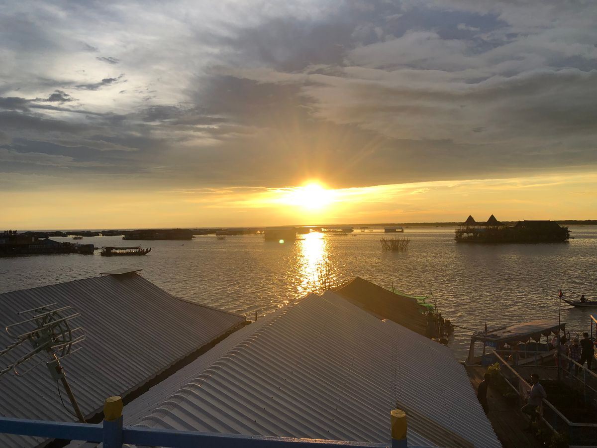 5月は乾季で一番量が少なく、水も濁っており決して綺麗ではありません。しかし、このツアーはの醍醐味は、水上で生活している方たちの雰囲気を見れることでした。世界にはこのような生活をしている方がいると思うとすごくいい経験でした。(ワニも見れますし、蛇もクビに巻けます)(笑)。最後に一瞬夕日を見れて幸せでした。