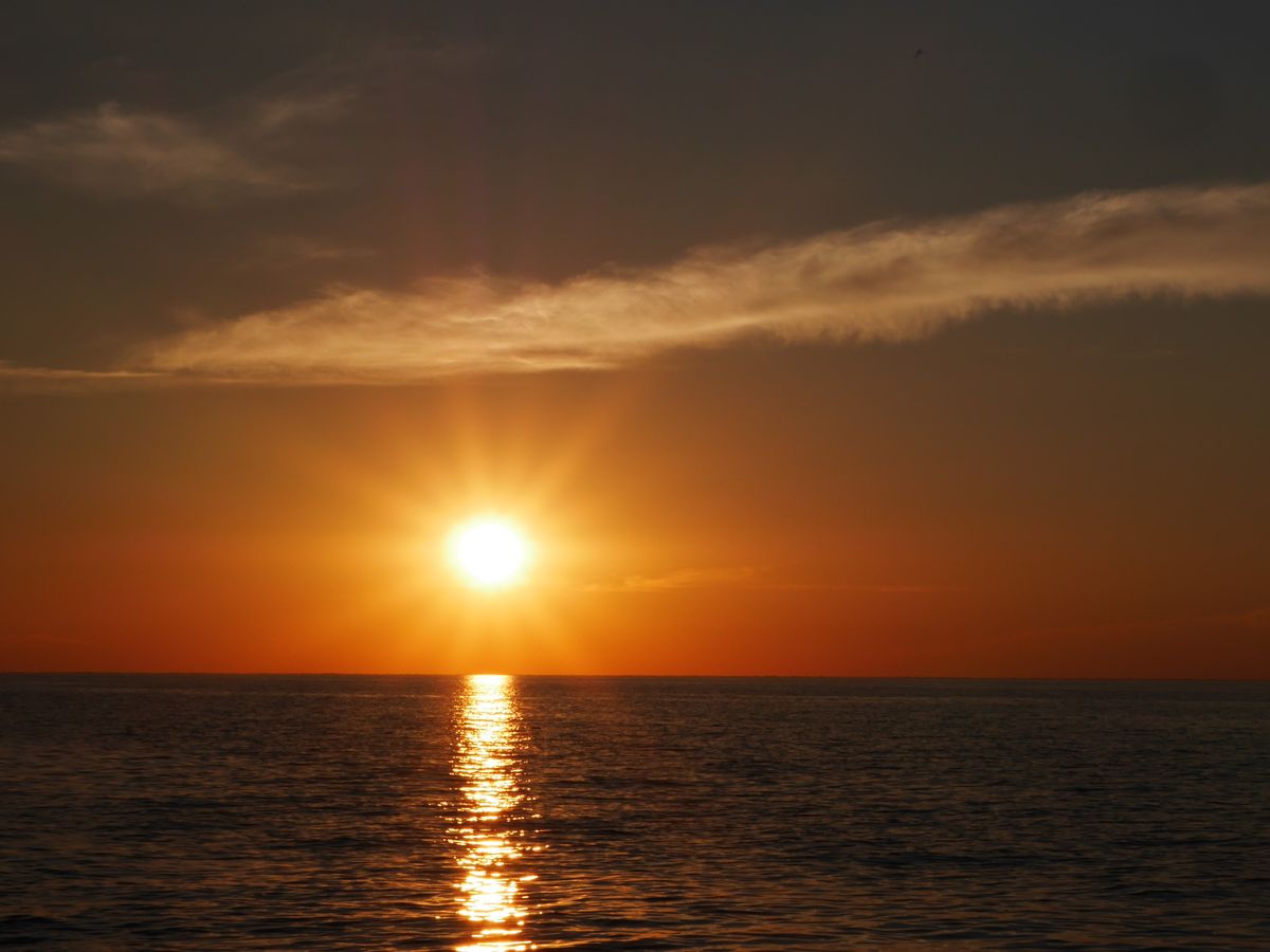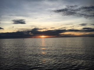 ガイドのワットさんのスマホにあったような「水平線上のまん丸な夕陽」という訳には行きませんでしたが、水平線のすぐ上にたなびく雲の間からとても綺麗な夕陽が見えました。また、刻一刻と変わる雲の色もとても素敵でした。