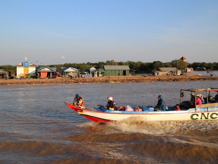 そこへは、エンジン音、水しぶき、心地良い風を身近に感じることができるチャーター小型船で行く。水をぐんぐん切りながら前進すると、学校、教会、生活用品を売る店が見えてくる。トンレサップ湖と共に生きる人々は、水を交通手段とし、生活の糧とし、子供たちは遊びの場としている。