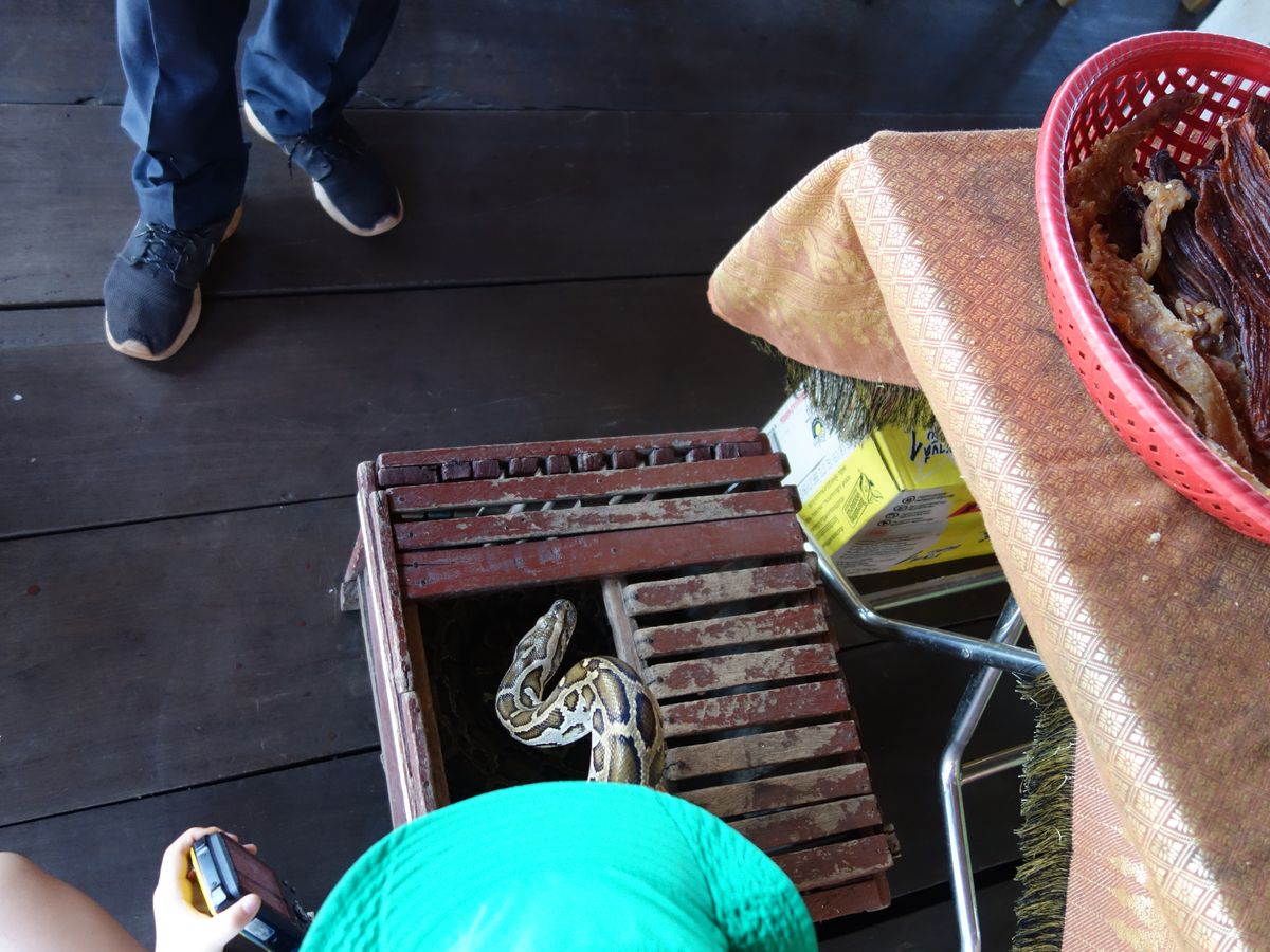 遺跡群をまわるツアーとは違い、車と船での移動ですのでのんびりしたもんです。参加したのが雨季と乾季の境目くらいでしたので、一番水量が多い時期とのこと。ツアーは船着場までバスで行き、そこから船でトンレサップ湖に浮かぶ休憩所までボートで行って休憩して帰ってくるものです。休憩所ではビール等も売っており、のんびりできました。遺跡群と比べてしまうと感動は薄いですが、悪くないです。午後一番の飛行機を予約していたので、それまでの時間を有効に使うことができました。休憩所で大きな蛇を自由に触れたことがいい経験でした。