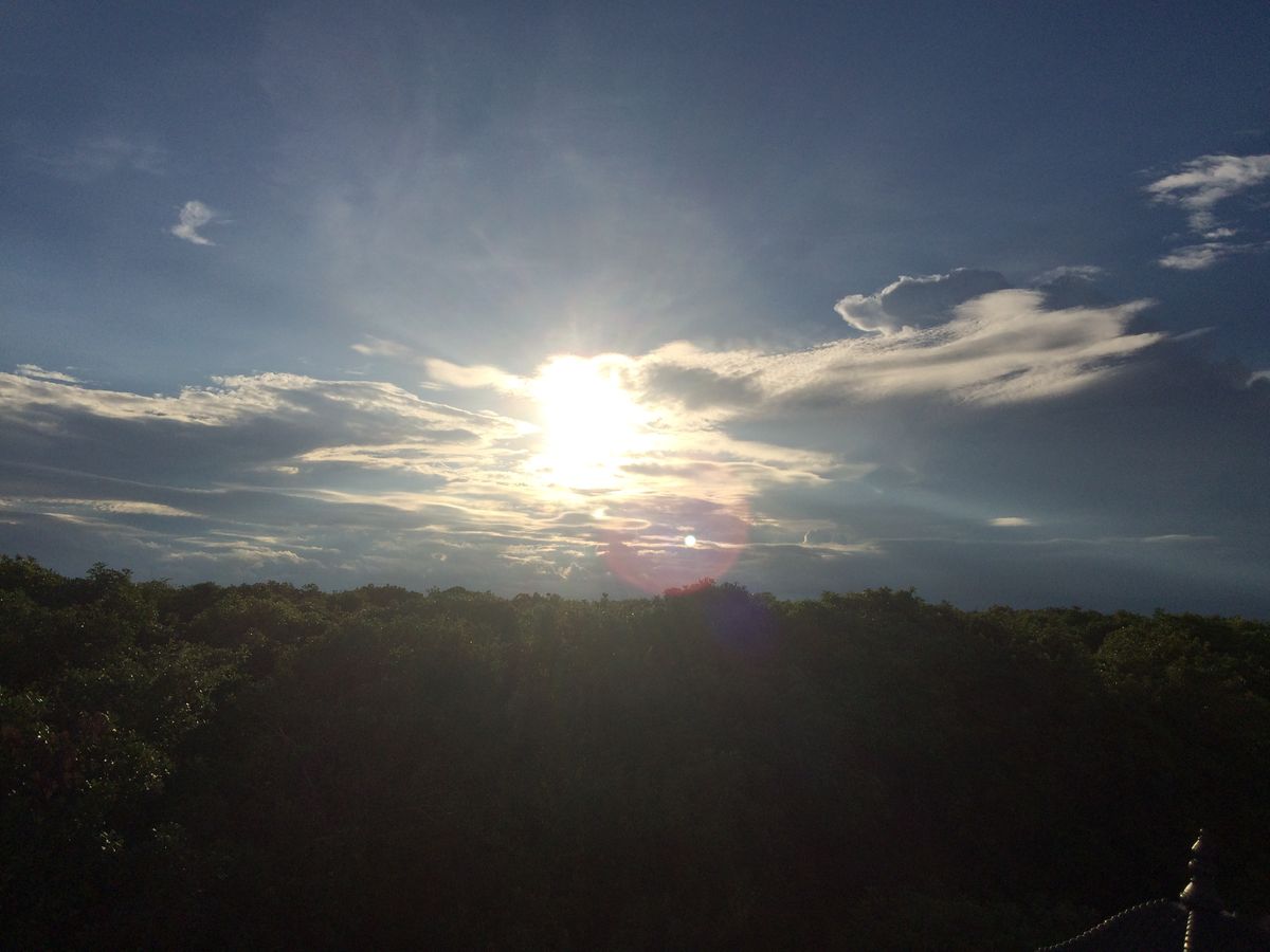 暑さの中、特有の匂いがあります。デッキのような場所で夕日を待ちますが、木が茂り