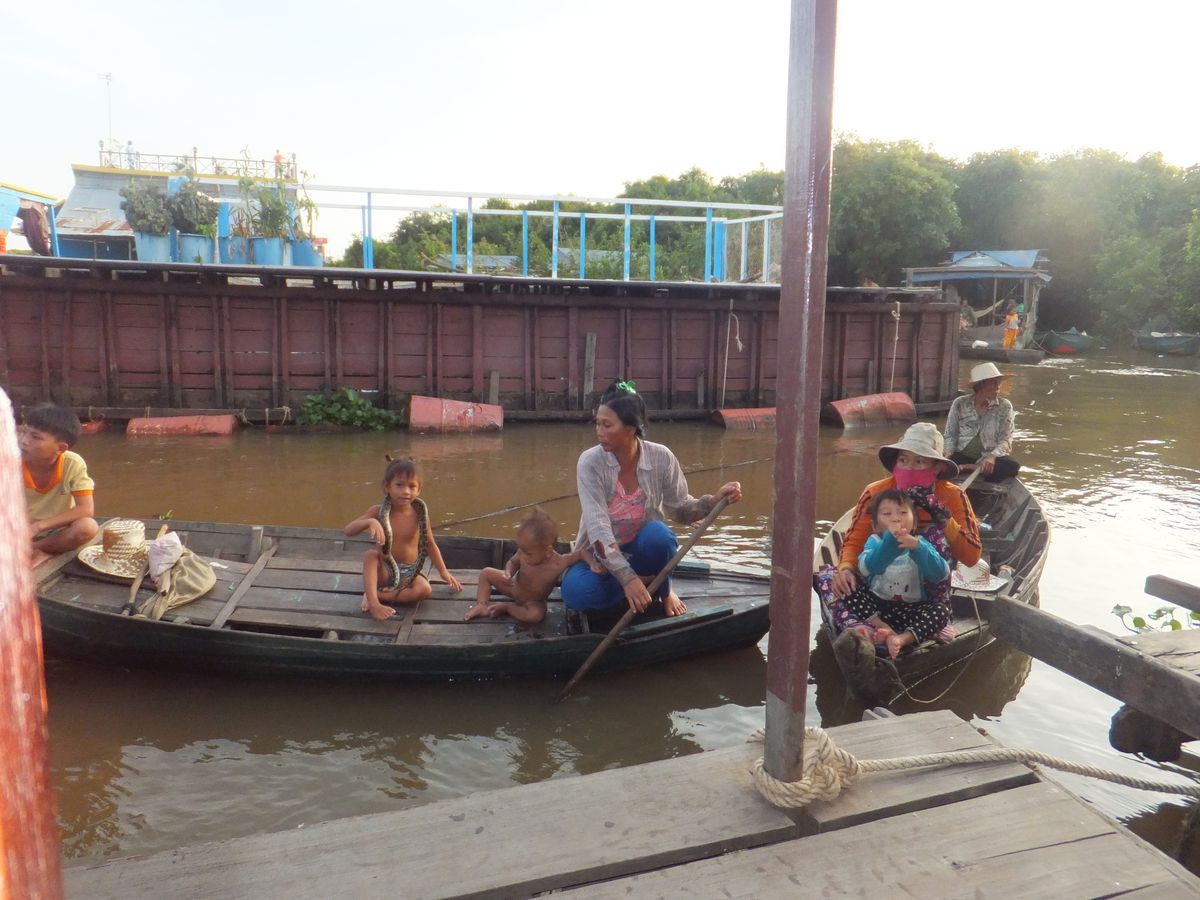 待ち時間の休憩中に、休憩場で座っている近くまで現地の子ずれの人たちが船で近付いてきて親しげな表情でこちらを見ていたので思わずカメラを向けて写真を撮ると、指で「1ドル」くれとジェスチャーしてびっくり。モデルになったので1ドルってことなんでしょう、あげる必要があるかどうかは別として、とりあえず1000リエル渡しました。どなたかが書いていたマッサージ少年もいました。まあ、これも経験。きれかった夕陽と同じくらい心に残る思い出です!