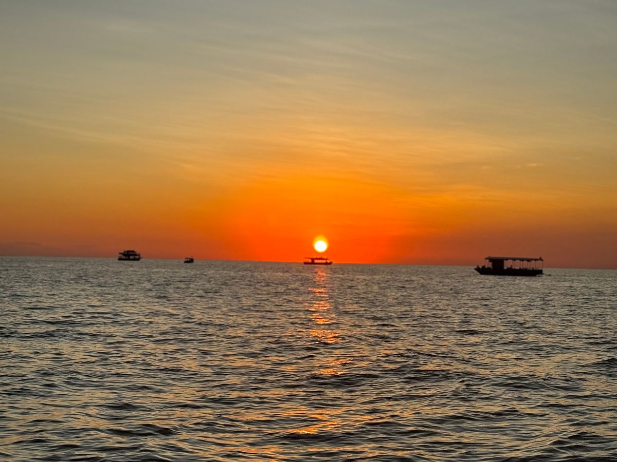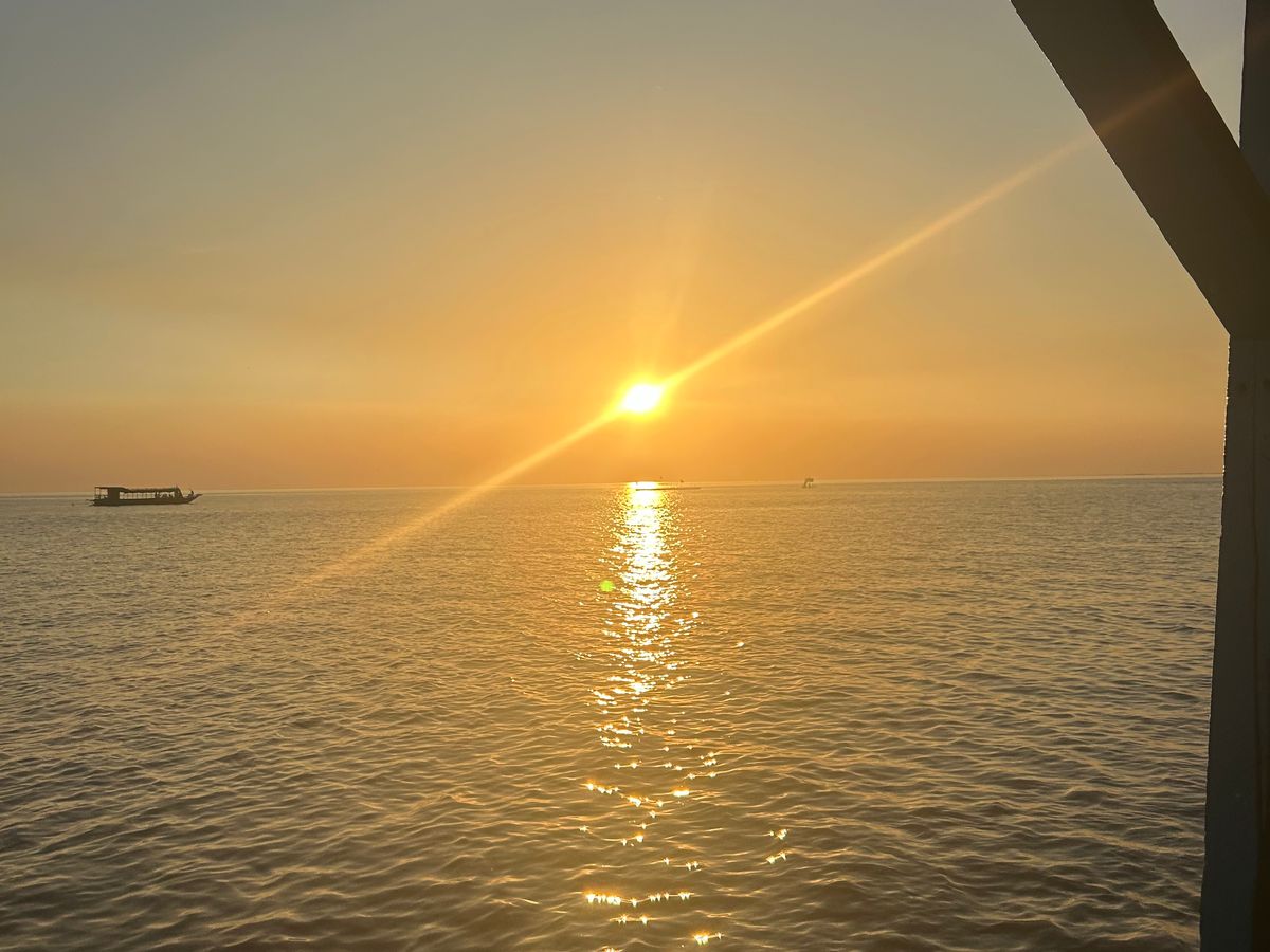 というのはトンレサップ湖の人々の様子を間近で見たり、学校の様子を覗けるのかなと、思っていたのですが、横をボートで通り抜ける時にガイドさんが説明してくれるのみ、、え!?と思っちゃいました。さらに陸からボートに乗って夕日を見るための舟着の筏の上で1時間ぐらい夕日を待ちます。普通に眩しすぎて、暑すぎて大体沈む10分ぐらいしかみんな太陽を見てません。