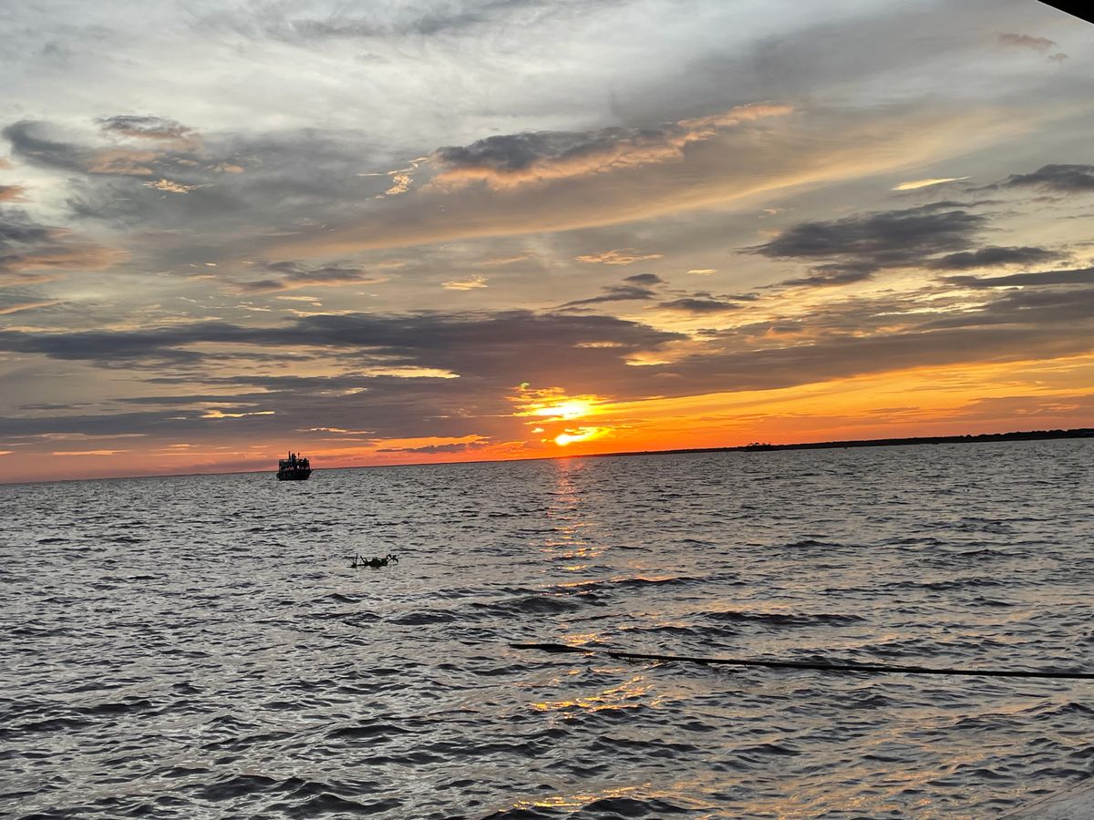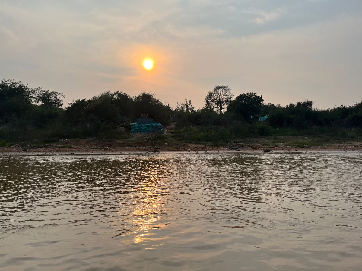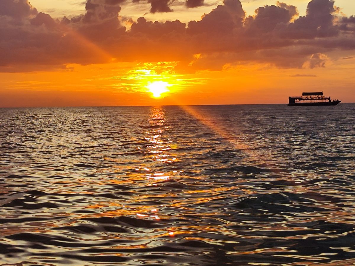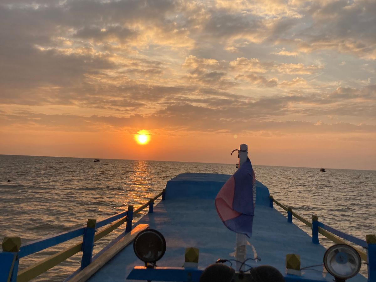 トンレサップ湖はコロナの影響で、他のお客様がいなくて貸し切り状態。船が少し揺れたら、船頭さんはマングローブの茂みの近くに寄ってくれました。この日、雲がが少しあったけど、水平線に沈む夕陽が雲を紅く染める様子はとても印象的でした。