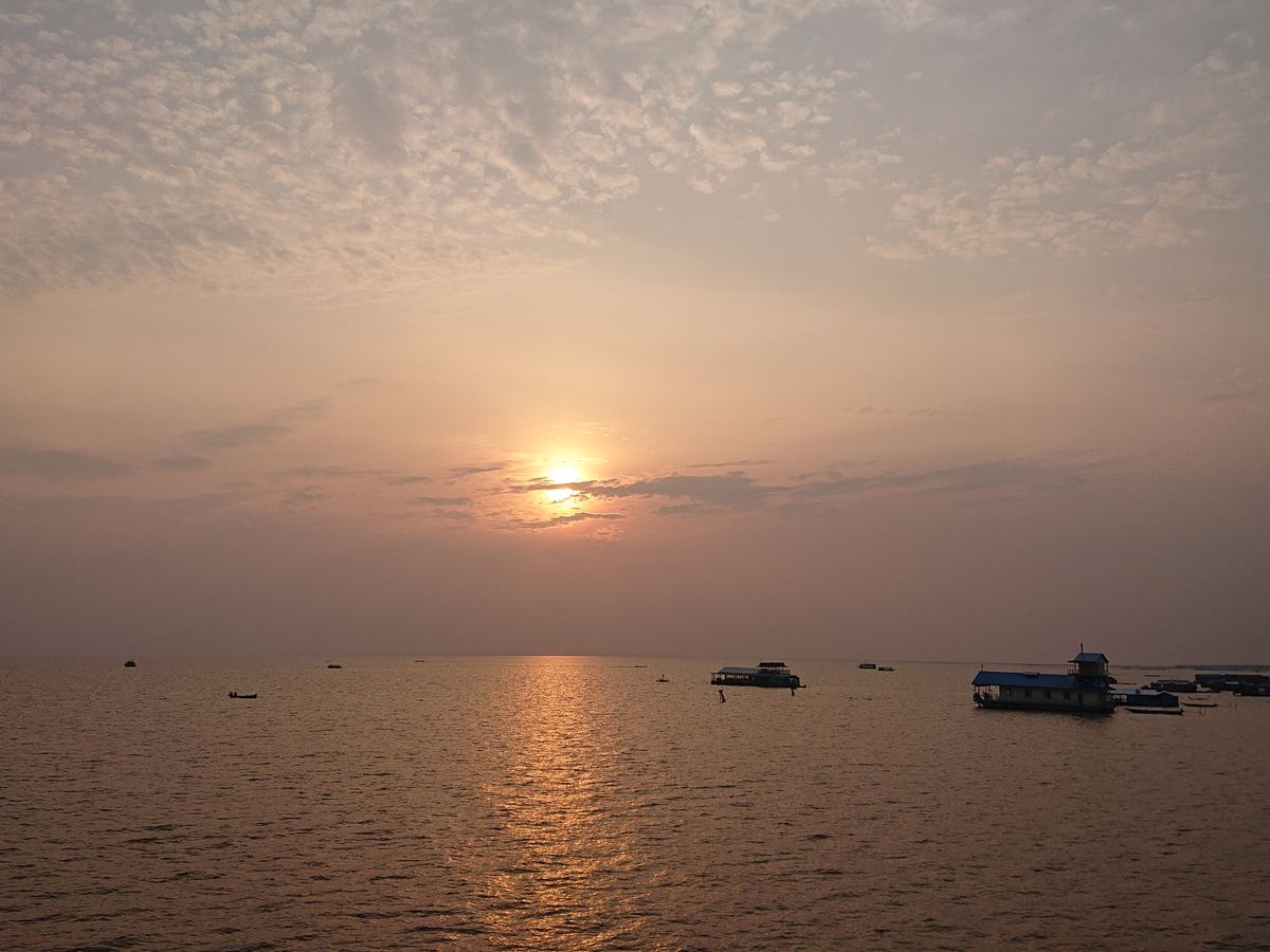 残念ながら曇りで夕日は見れませんでしたが、水上生活のかたは、雨季、乾季の水位の変化に伴い、住居場所をさせることに興味を持ちました。水位差は5-6mとのことなので、次回は乾季に訪問してみたいと思います。