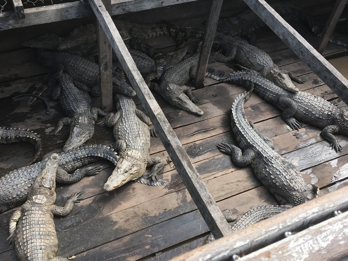 途中で浮き島?浮きボート?によって養殖ワニを見ます。
