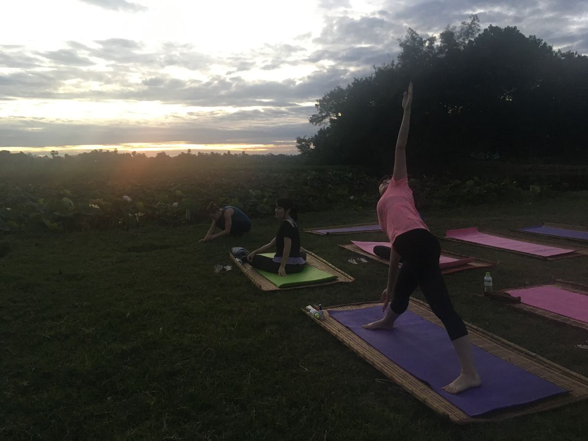 大自然に囲まれて広い空の下でのヨガはとても気持ちが良く、少し曇っていたのが残念でしたが、それでもオレンジ色のキレイな朝日が感動でした。