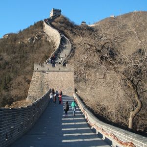 冬場の万里の長城は寒かったです。男坂半分と女坂半分ぐらい両方行ってみました。女坂は多くの人がいましたが、男坂は軍服(風)を着た人が2人いただけで、天気もよく自分たちだけで独占しているような気分は爽快でした。 ただ、猛烈な風で、マスクが凍るほど寒かったです。冬に行かれる人は十分な防寒具が必要です。道は凍っていないので歩く方は問題がありませんでした。