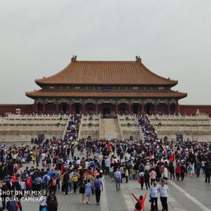 当日は天安門が何かの行事のため 入ることが出来ませんでした。何時もの出入り口が封鎖されたので 1km 程もすごい人混みのなか迂回路を炎天下のなか歩かされ 紫禁城の入り口で一時間半待たされました。他の団体は結構スムーズに入れていたので ガイドさんに何故私たちもツアーの列から入れないのか? と聞くと "私たちは少人数だから" と言われて そのまま待ちつづけました。2時間ぐらいして最初の検問を通過して直ぐに次の 検問で又また 45分位混み混みのなかで 持ち続けてやっとのことで中に入ることができました。ガイドさんはいい人のようですが 余りにガイドに 不馴れで日本語は余り分からない上に城の歴史については 簡単な説明で終わりました。中では50分も見ていません。