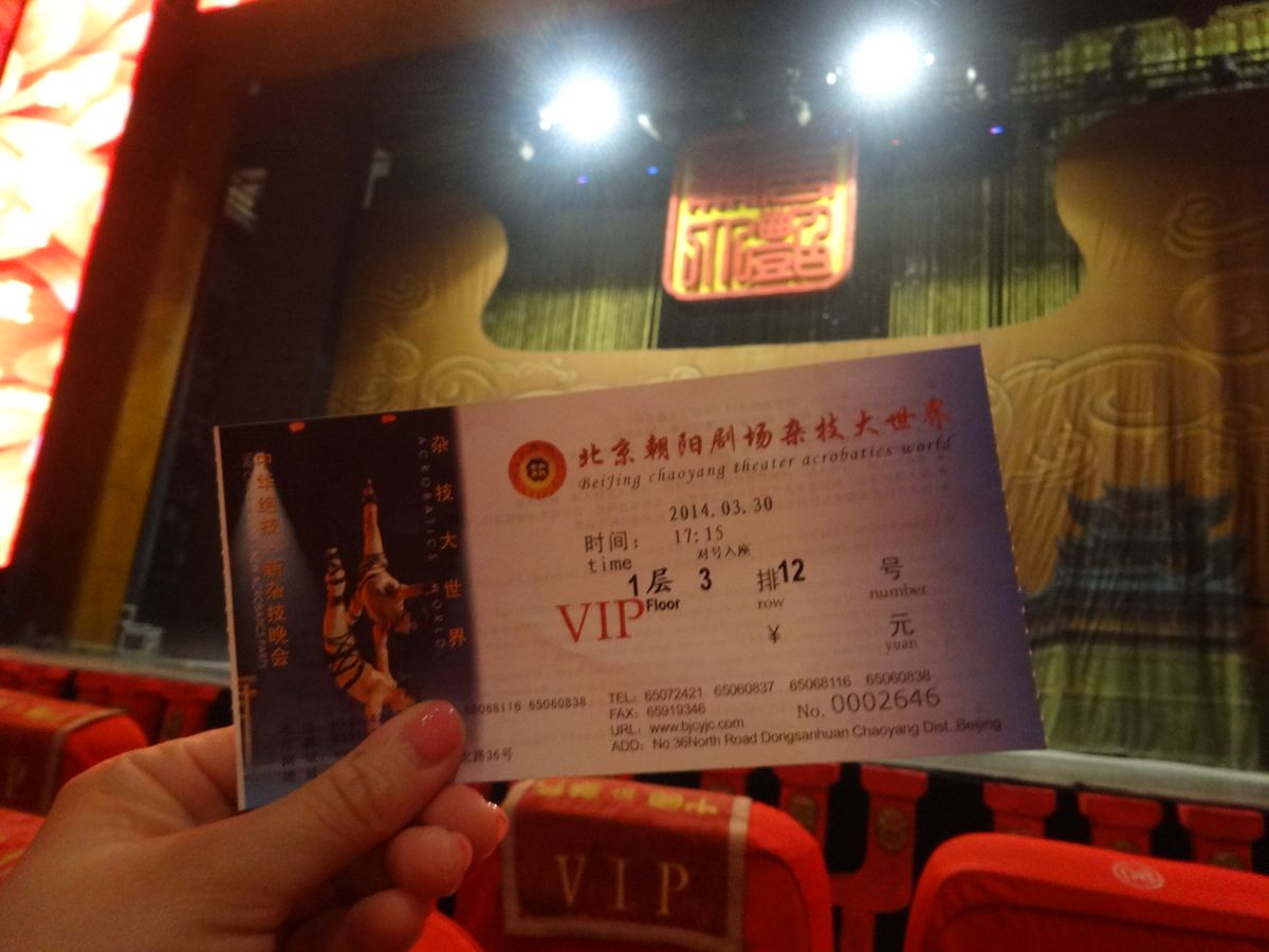 朝陽劇場の雑技団を見てみようと前日にダメもとで申し込みしましたがその日に返事が来て土曜日にも関わらず前から4列目の真ん中をとっていただきました。とても迫力があり見易くおすすめです!周りの中国人ツアー客がガヤガヤうるさくその音を消すためか雑技団の音楽も大きかったです。スタッフとの引き渡しもスムーズで助かりました。駅のC出口がC1とC2があったがC2出てすぐです。