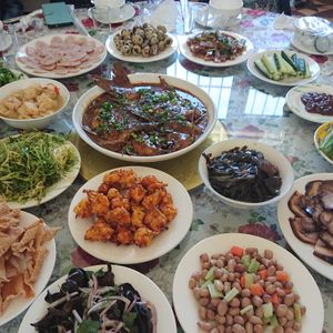 昼食の店構えは立派です。円卓にてジャージャー麺等頂きました。品数・量が割と多かったです。