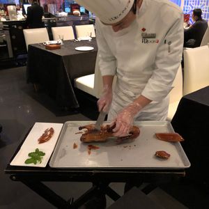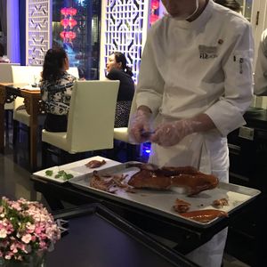 人気のお店なので、予約をしてよかったです。親子二人でしたので、他の料理も食べてみたく小籠包のようなものを注文、北京ダック1匹は多かったですが(女性2人)、半分などが出来なかったので、1匹。少し残しましたが、とても美味しかったので満足しています(^^)/英語が通じますが、翻訳機で中国語で聞いても対応可。写真付きのメニューだったので指さしでもOKでした。お会計はテーブルで行いました。サービスも良かったのでお勧めできるお店です。