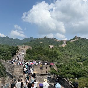 マイクロバスで2家族のツアーでした。入口からすぐの階段がかなりの混雑で注意を要します。女坂の緩やかな方を進みましたが、先に進むほど勾配が急になり、また混雑もひどくなります。北3号楼まで登りましたが天気も良く遠くまで万里の長城が見渡せるため、圧巻の景色でした。また8月で日差しは強いですが風が涼しく心地よかった。帰りは途中で頂上から降りるルートを通ると下りやすいです。ガイドのチョウさんはチケット手配までついてきてくれますが、長城の中にはついてきませんので、自由に観光でき、時間通り出口から出るとチョウさんと予定通り合流できました。