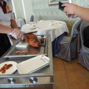 ランチはボリュームがあり、有名店の全聚徳なので店内は豪華で綺麗でした。北京ダックは3名で半身くらいの量で、その場で切ってくれます。前菜(あひるの爪、冷菜)、温菜(野菜の油炒め、酢豚)、スープ二種、北京ダック(小麦粉の皮とパン)、フルーツ、お菓子がでました。食べ切れなければ、パックで持ち帰りができました。