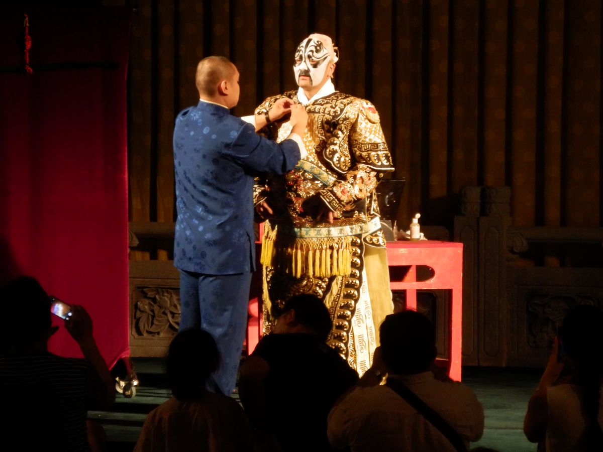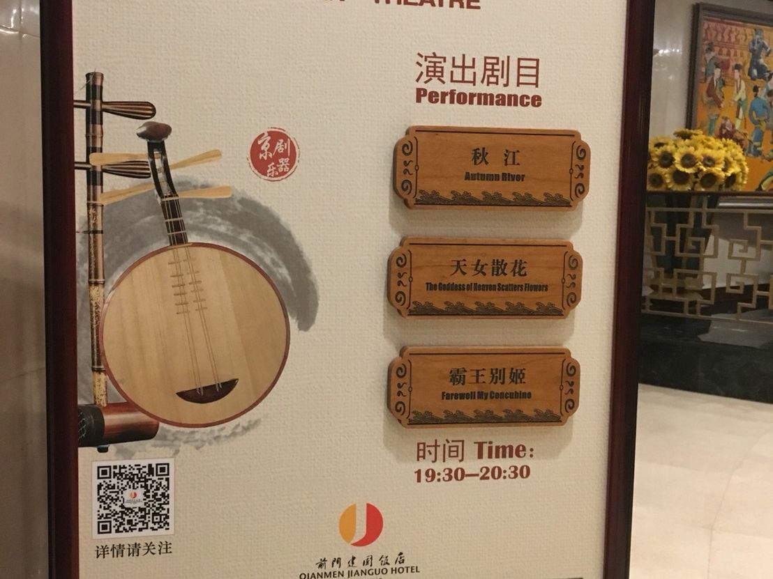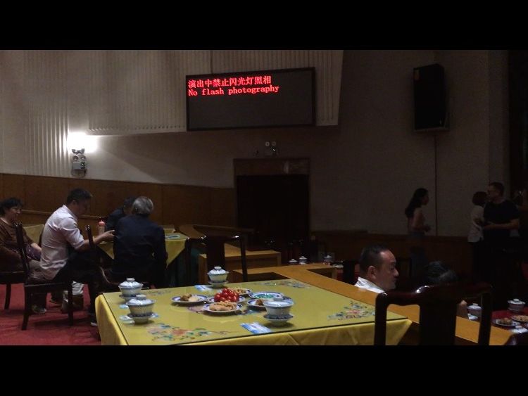 別のアクティビティのチケットを引き換えた際に、こちらのチケットも受け取りました。帰りは地下鉄でホテルに戻りましたが、夜遅く、見知らぬ土地を15分くらいだったでしょうか、ひとりで歩くのは少し怖かったです。地下鉄内は明るく、人気はないけれど、あまり不安にはなりませんでした。中国に来たのだから、中国っぽいことに参加したくて、京劇を初めて見ました。劇が始まる前、舞台上で出演者の着付けやメイクを見れました。撮影も可能。始まるまでは舞台前まで近付け、その様子が間近で見れました。前方のテーブル席はお茶つきでしたが、私はただのイス席を予約しました。イス席は普通の劇場や映画館のような席です。とても空いており、テーブル席は地元かアジア系のファミリーなどでしたが、たまたまか、後方のイス席には、欧米人のグループ10人くらいが私から少し離れた場所に座っていました。彼らは京劇の独特な声に苦笑。私は京劇がどんなものなのか知らなかったので、もちろんその声や歌に驚きましたが、伝統芸能ですし、笑う気持ちには一切なりませんでした。その欧米人たちは凝られ切れず、笑い声が漏れたり、途中で何人も席を離れ会場を出ていったりして、私は非常に不愉快でした。半数以上が空席の中、彼らの行為が演者たちに伝わったと思うと、非常に悔しいです。もし彼らが歌舞伎や狂言を見たら、同じように笑うんでしょうね。文化の違いとはいえ、とても悲しいとこです。