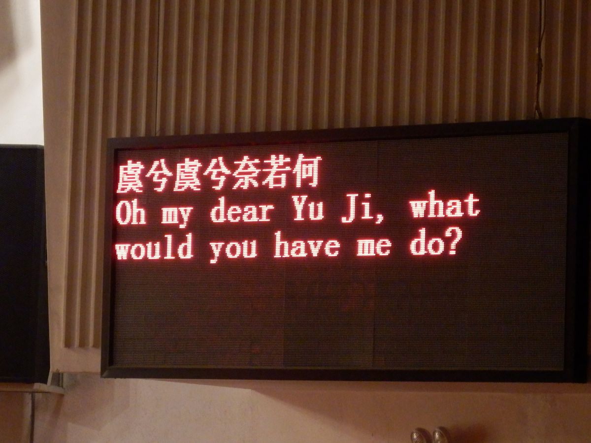 京劇はもし英語の字幕が出ても読もうとせずに、舞台の俳優さんだけに集中した方が一瞬の表情を見逃さずに済みます。(英文を一瞬で読める人以外は)