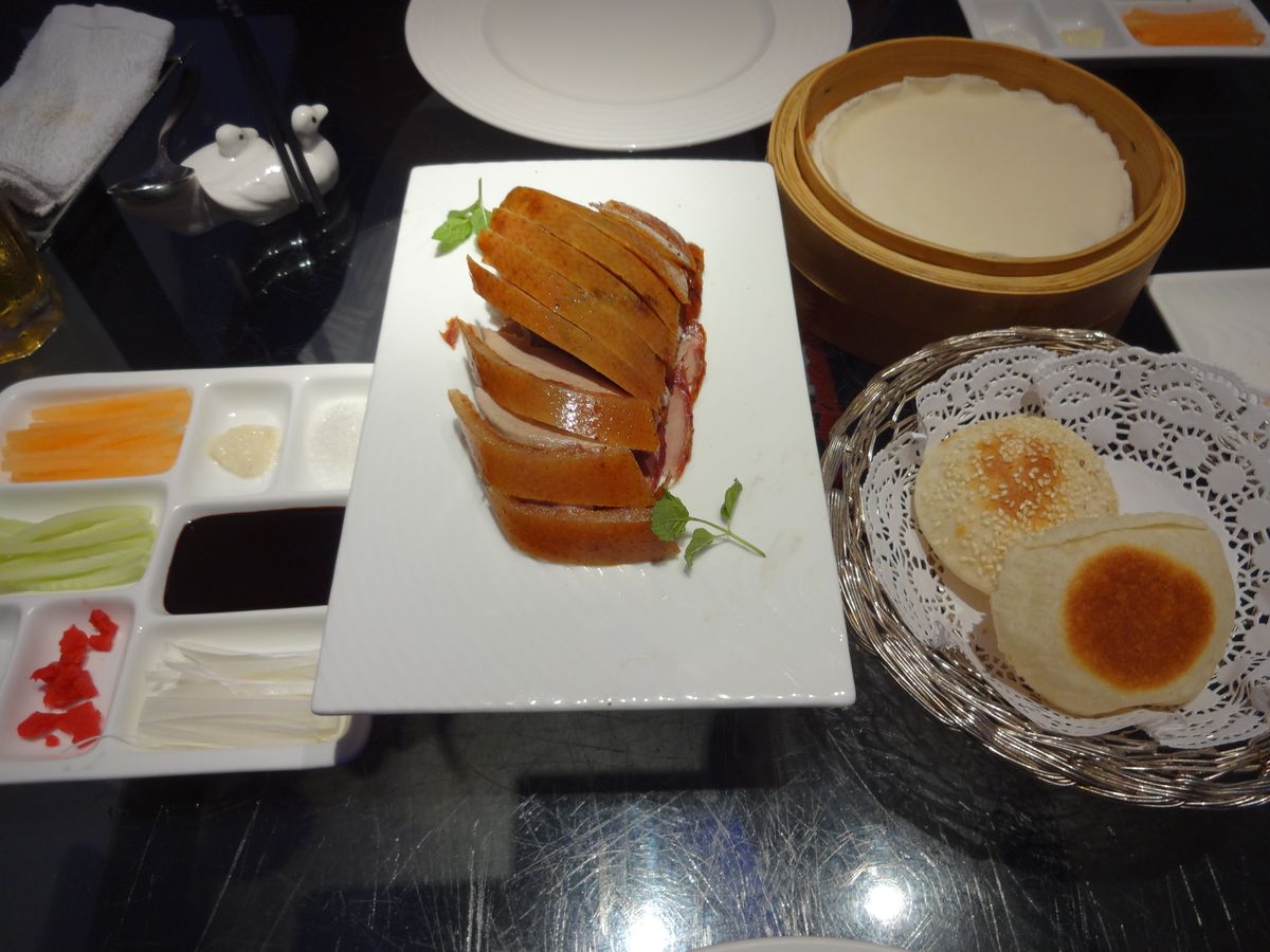 いよいよダック登場!写真で伝わりますか?見た目にも美しい、もちろん味も!ダックを挟むパンみたいのやクレープみたいなの、千切りの野菜やタレもちゃんと付いてました!(当たり前だろう、と思わないでください・・・、初の本場中国ダックの注文、ダックの写真を指差し注文したものの、クレープみたいなのや千切り野菜が別注文なのか予め付いてくるのか不安だったのです)