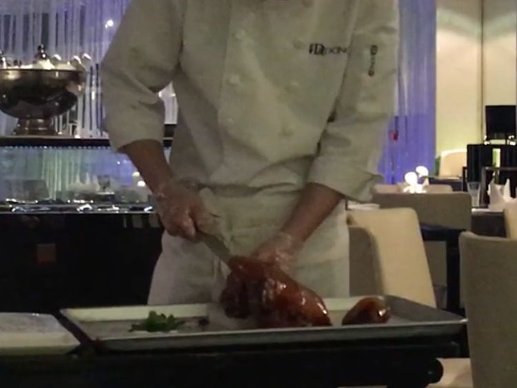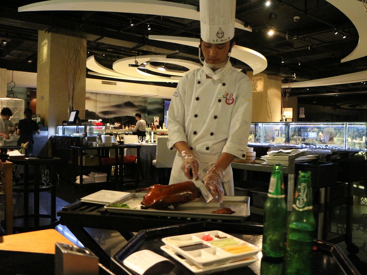 焼かれる前のダックを店内でスタッフさんが運んでいたり、焼いた後のダックをさばいてくれるスタッフさんがいたり、食べるまでの過程も満喫できます。