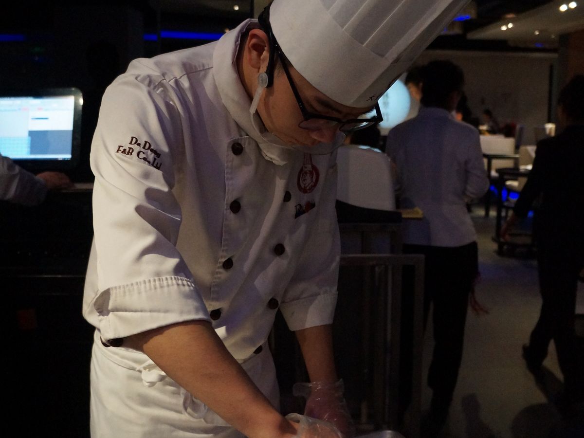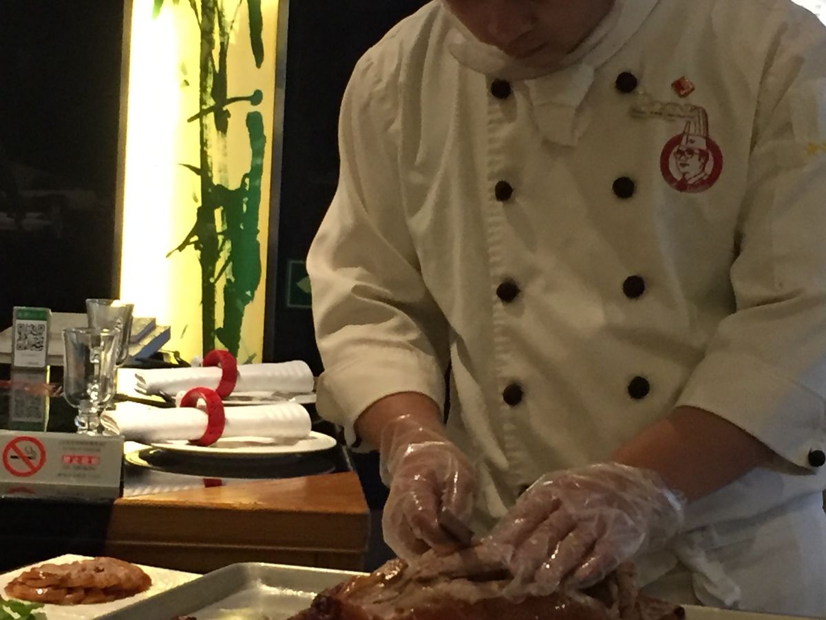 料理を待っていると・・・店員さんが中国語でペラペラ話しかけてくるではないですか!(全く理解不能でした・・・)が、着席後周りのお客さんの様子を観察していた私は、この店員さんが「北京ダック切るから見に来ていいよ~」と言っているのだろうと勝手な推測。実際、私たちのテーブルから少し離れたスペースで、白い帽子のコックさんが台にダックを載せて見に来るのを待っていました。席を立ち、見に行くとダックを切り始めてくれましたよ!私は3分位して勝手にテーブルに戻りましたが。
