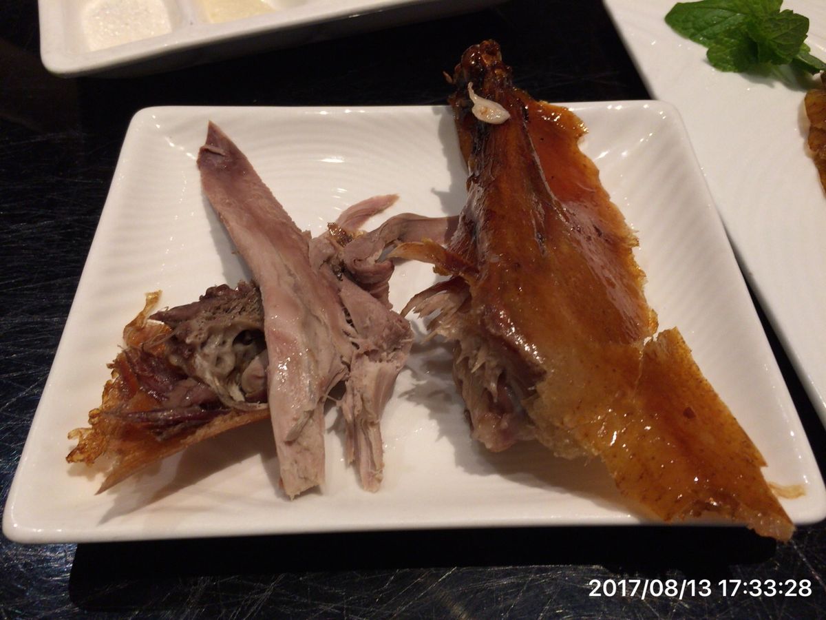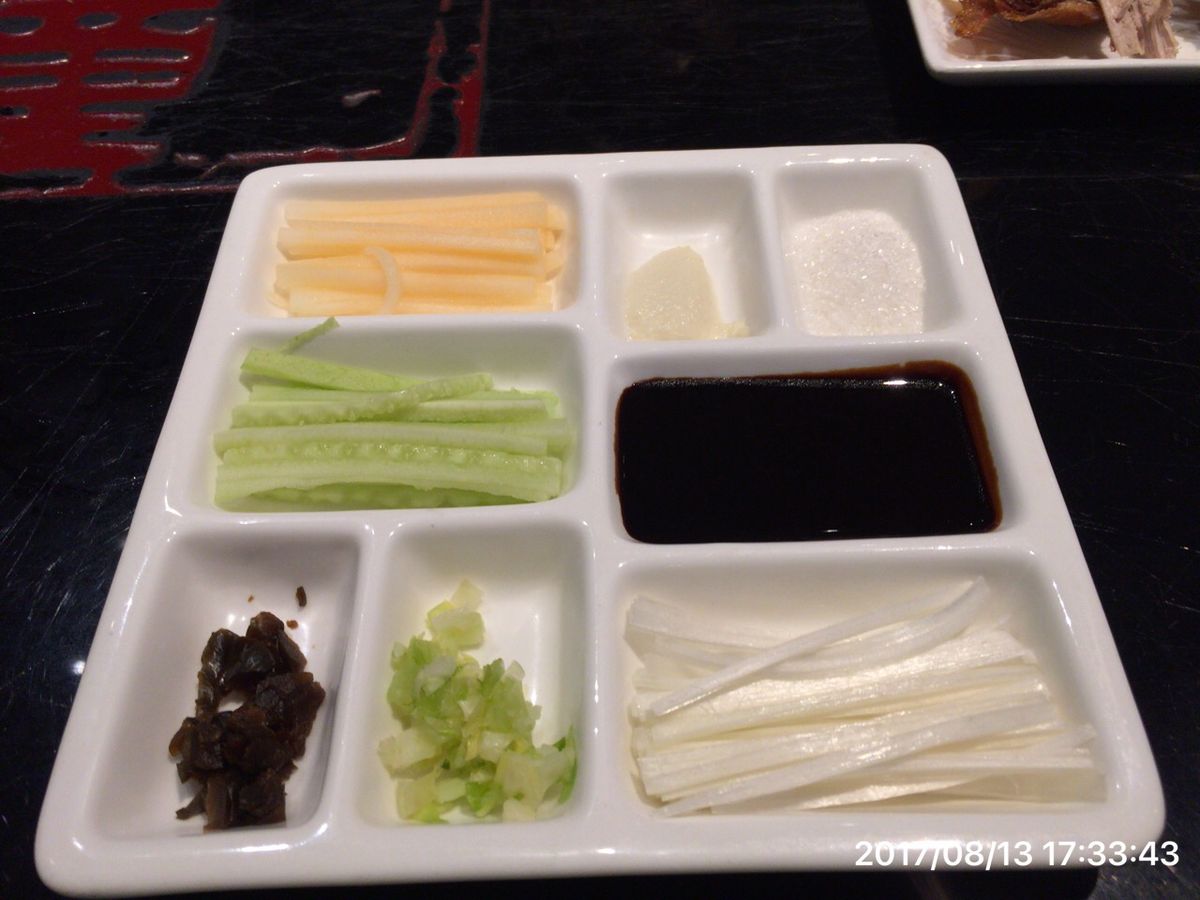 北京烤鴨は大小2サイズありますが、大1羽を4人で分け合って丁度良かったです。目の前で捌いて、美しく盛り付けてくれます。薬味は4人分注文しました。生春巻の皮は北京烤鴨の注文に含まれているようでした。蒸籠に5枚入りですが、無くなるとお代わりがもらえました。まず最初に店のスタッフがパリパリの皮の部分を薬味のザラメに取り入れて勧められました。何とも言えない美味しさでした。次に北京烤鴨にタレを付け、薬味の野菜スティックを巻いて見本を作ってくれました。とてもあっさりしていて美味しくて沢山食べても胸焼けもしませんでした。