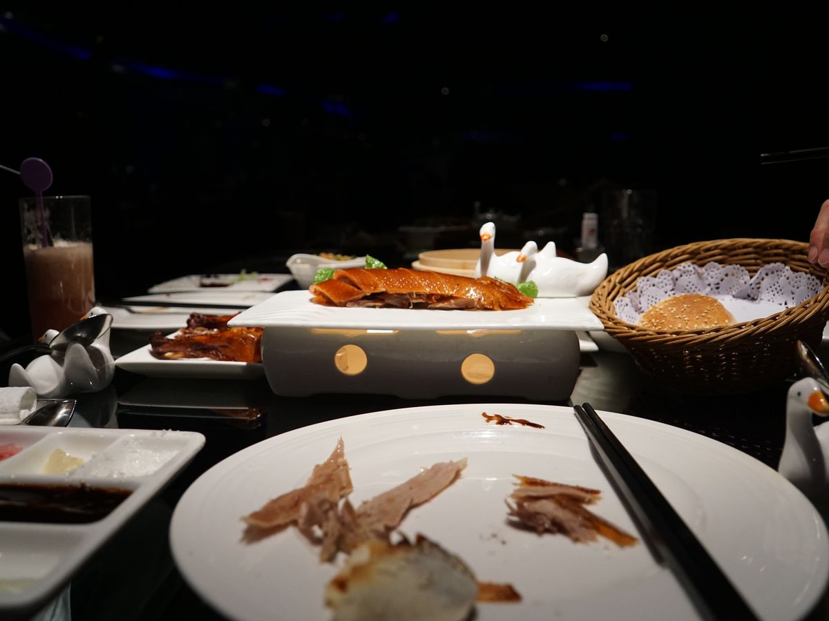 雑技団は大体どこも同じ程度、と思い特に期待はしていませんでしたが、球状鉄格子のバイク乗りは8台も入り圧巻でした。また、北京ダック食べ放題もダックの切断実演から始まり、食べきれない量のダックでした。その他の料理もおいしく、メンバーで十分に楽しめた非常に良いコースでした。