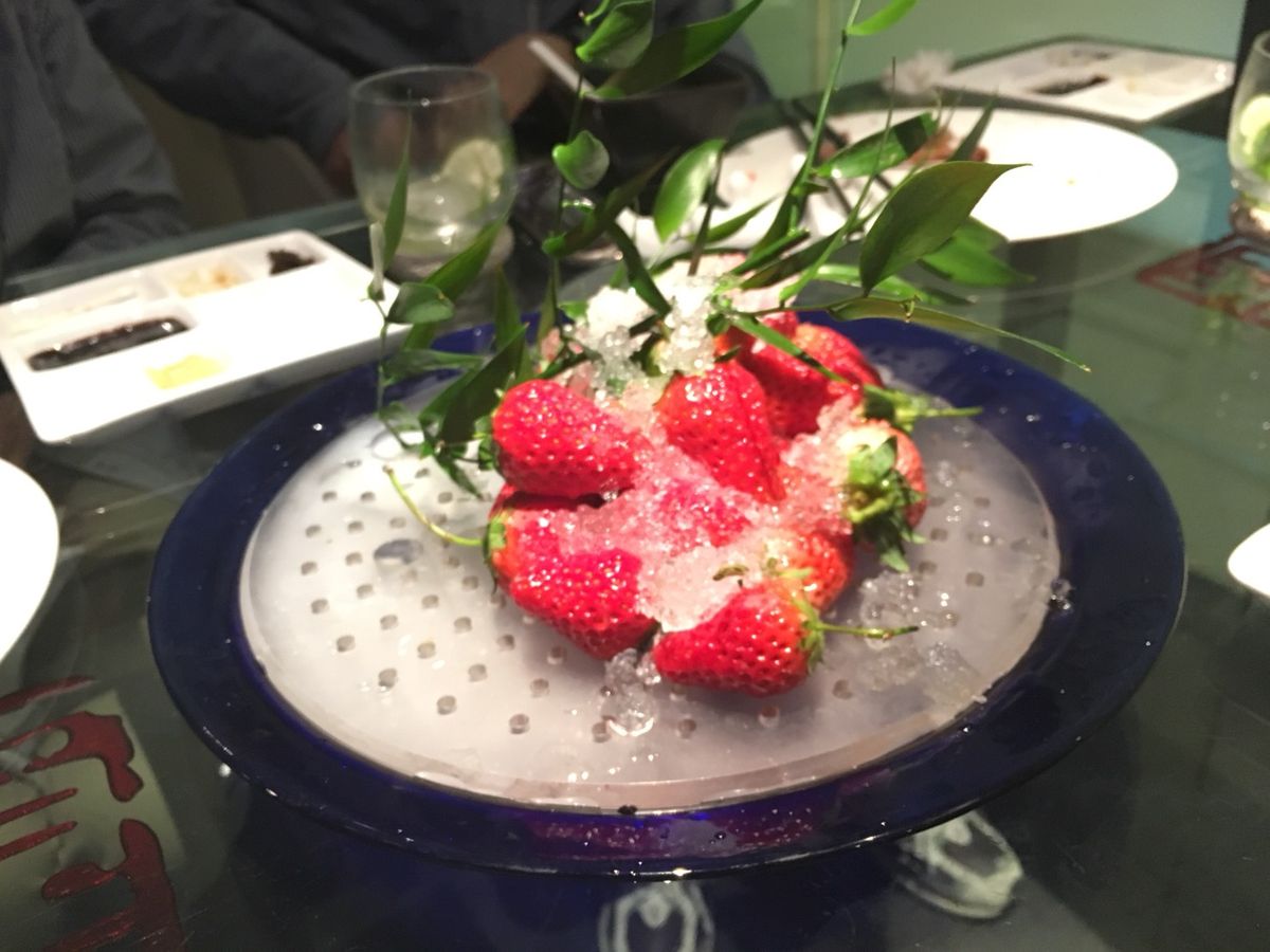 これだけで646元でした。少し足りないから追加注文しようかと思っていたら、スープとフルーツ(イチゴの盛り合わせ)が届きました。え?注文していないです。間違いです、と言ったら、サービスだとのことでした。信じられないぐらいの豪華なサービスでした。北京烤鴨も料理も飲み物も、全て美味しくて、しかもリーズナブルで大満足でした。