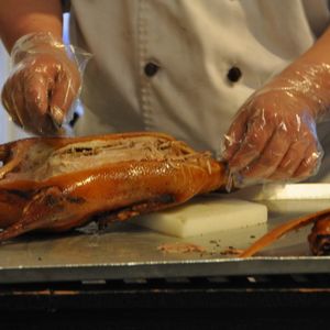 北京ダックは、味付けした鴨(アヒル)を丸ごと焼き上げる、代表的な中華料理です。明代の宮廷料理として生まれ、現在では世界中で親しまれています。 鴨の脂肪は吸収されにくいという特性があるため、中国でも美容と健康の食材とされ、女性に嬉しい中国料理です。食べ方は皮をパンに挟んだり、薄い生地で巻いたりと店によって多少の違いがあり、残った肉は炒め物などに利用し、最後に残った骨はガラスープとして飲むのが一般的です。 日本では高級とされている北京ダックですが、中国では必ずしもそうではありません。北京市内にはたくさんの専門店があり、コース料理などもリーズナブルな価格でお楽しみいただけますので、ぜひ本格の味をお楽しみください。