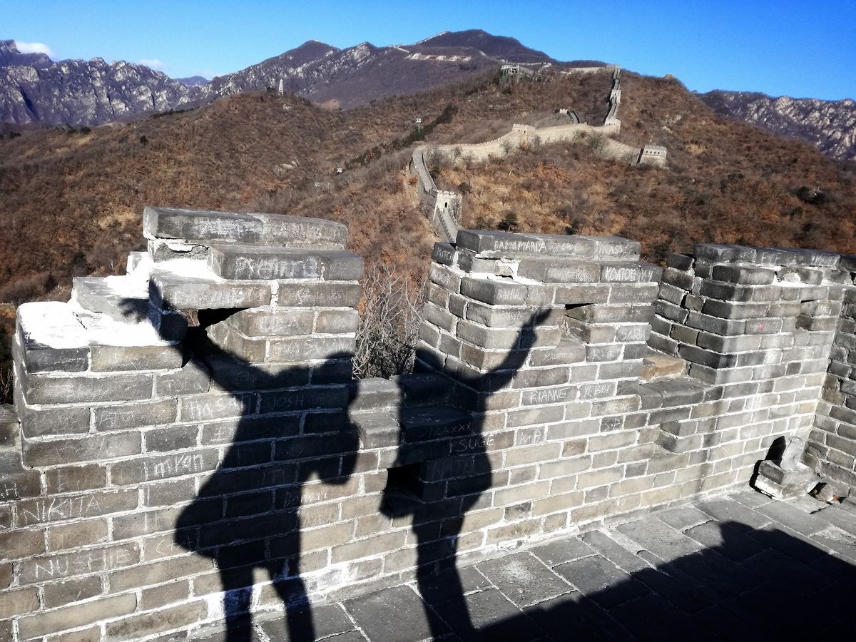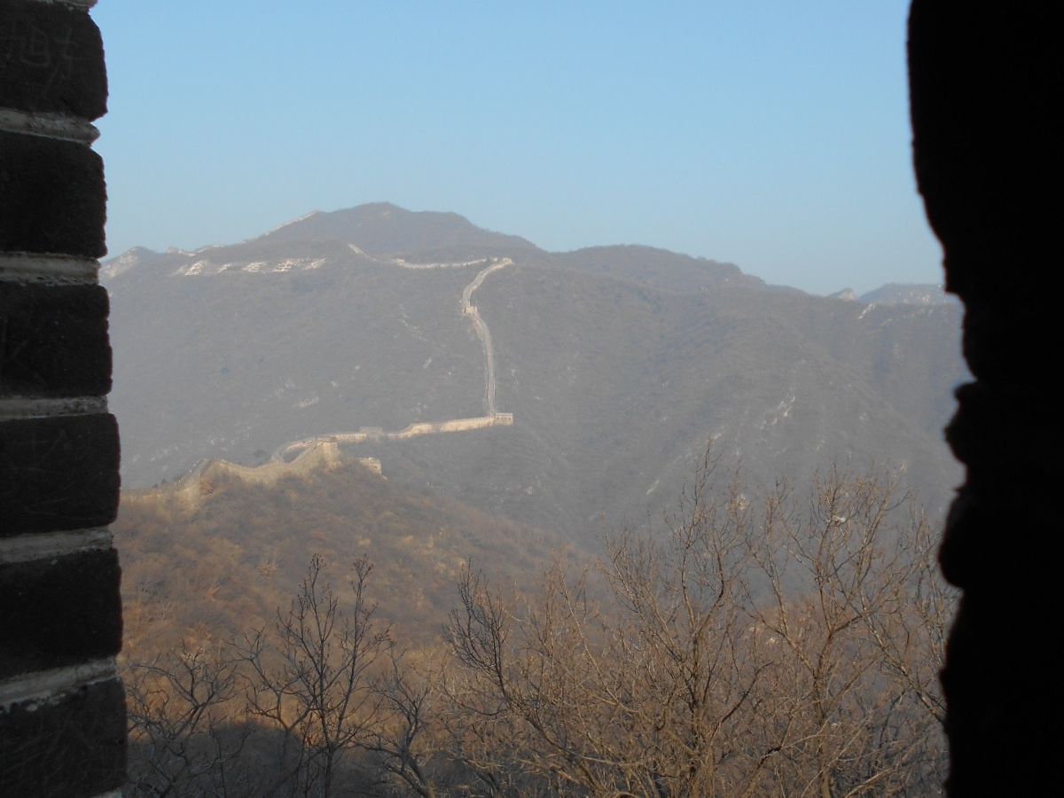 長城はさほど寒くなく(おそらく摂氏3度くらいかとは思いますが)、歩いているうちに汗をかいたため、セーターを脱いだほどでした。Tシャツ、薄手のトレーナー、(脱いだセーター)、North Faceの薄手のジャケットという服装で、暑がりの私は十分でした。