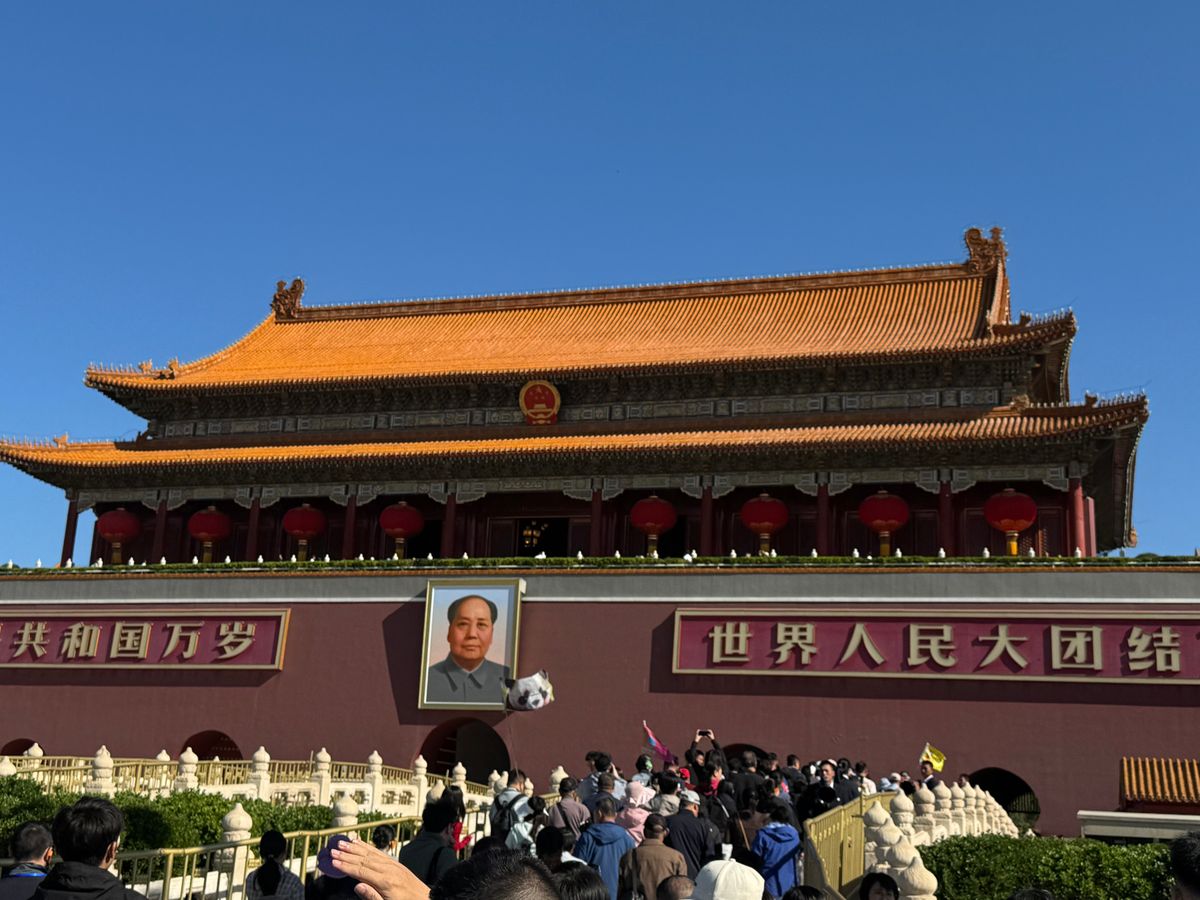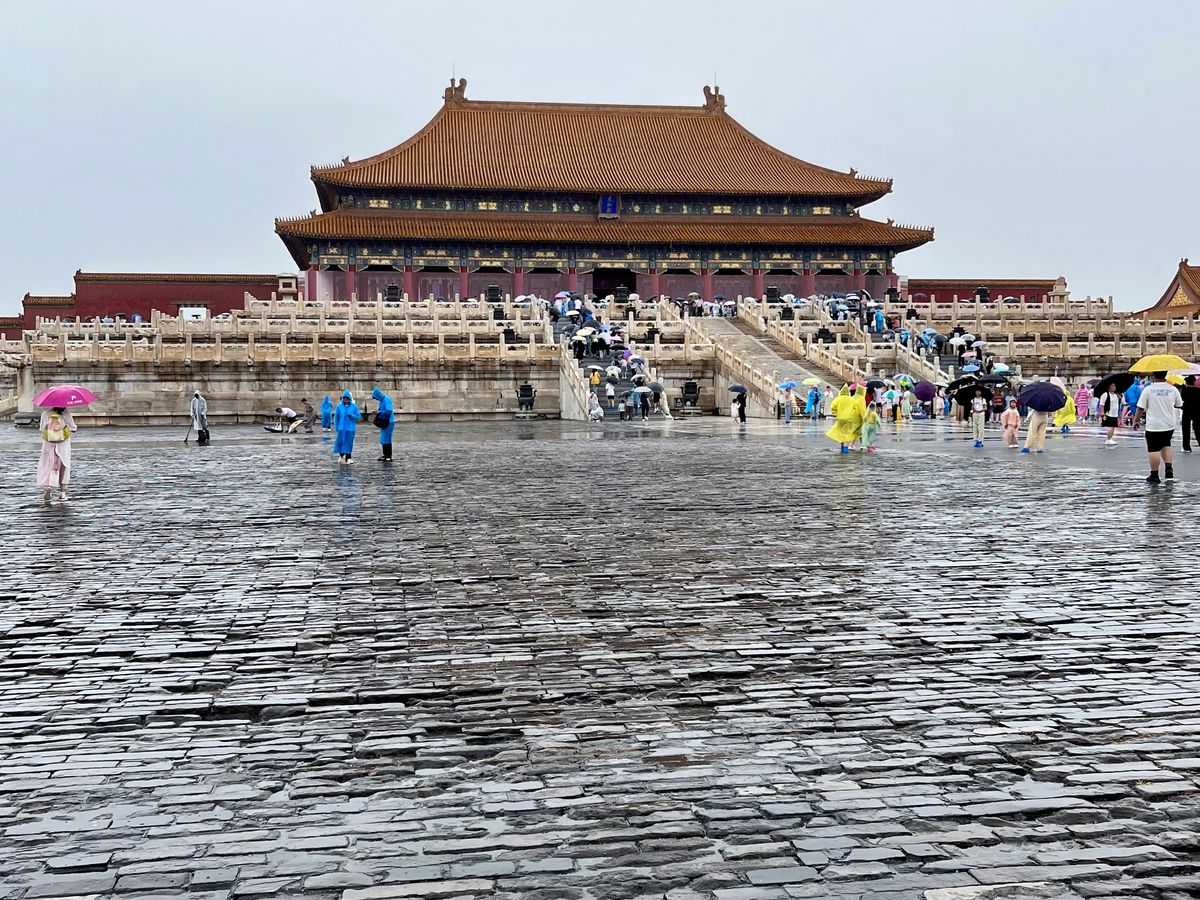 昼食は市内ショッピングモール2階の四川料理店で、事前に用意していただいた料理を堪能。麻婆豆腐以外は辛くなく、量もたっぷりで家族全員が大満足。午後は雨も弱まり、人民大会堂を通り抜けて天安門広場へ。行事のためセキュリティチェックが非常に厳しかったのですが、孫さんが事前に「持ち物は最小限に、筆記用具や紙も不可」と説明してくださっていたおかげでスムーズに通過できました。その後、念願の紫禁城に無事入場し、珠宝館も見学。孫さんの丁寧な解説のおかげで、歴史を感じながら見て回ることができました。