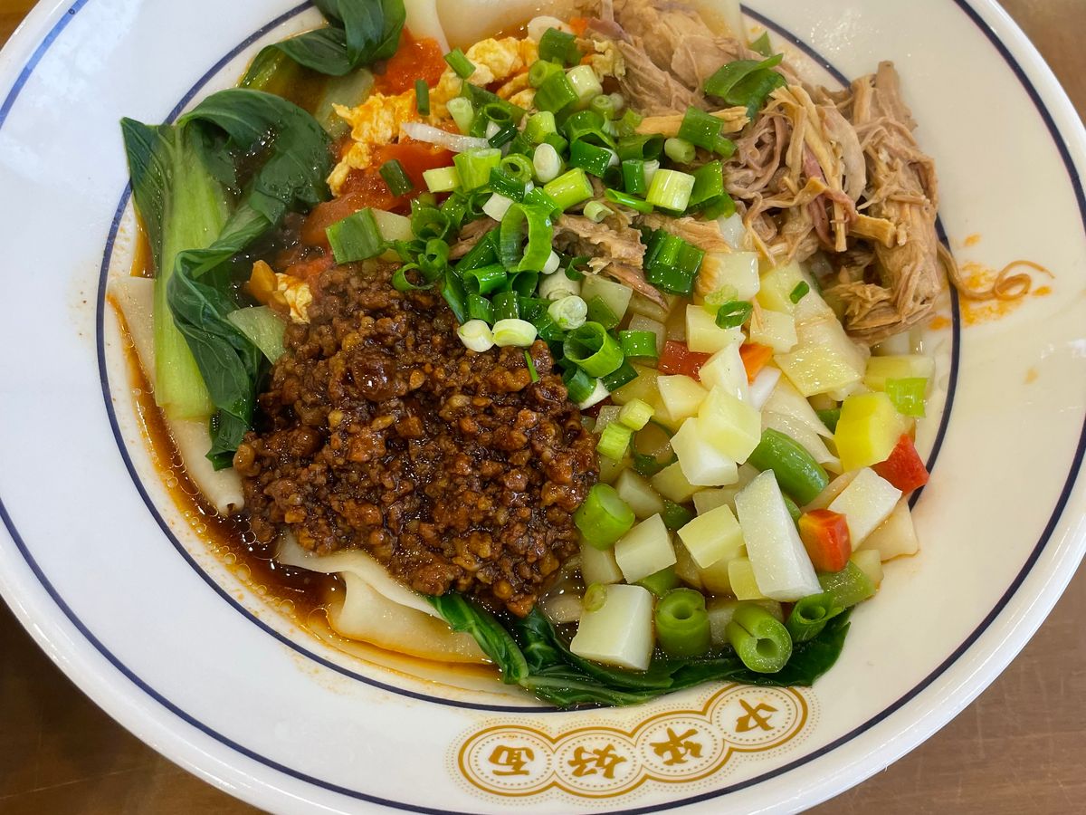 昼食はビャンビャン麺。辛さ(辣)は控えめにするのがオススメです。気になる方はペットボトルや消毒を持参して器を消毒すると良いです。
