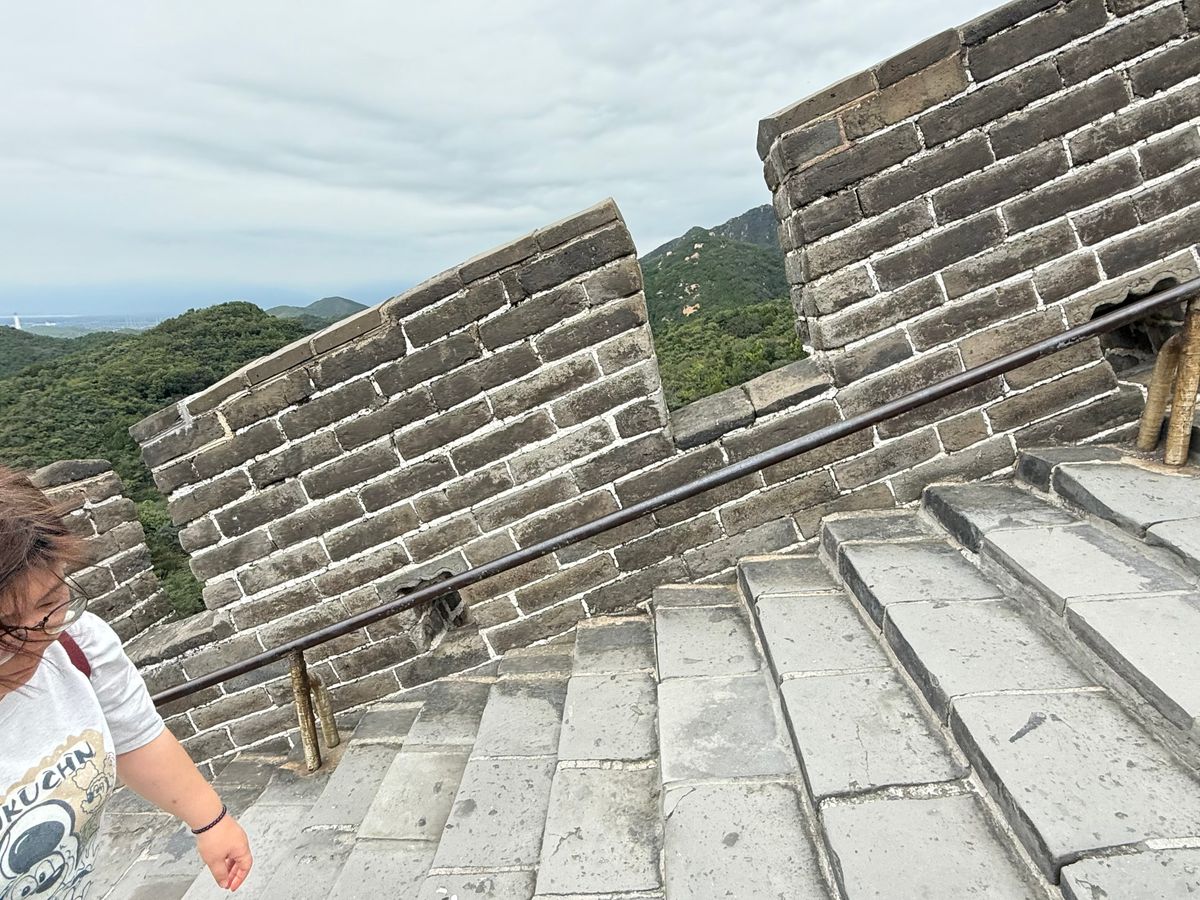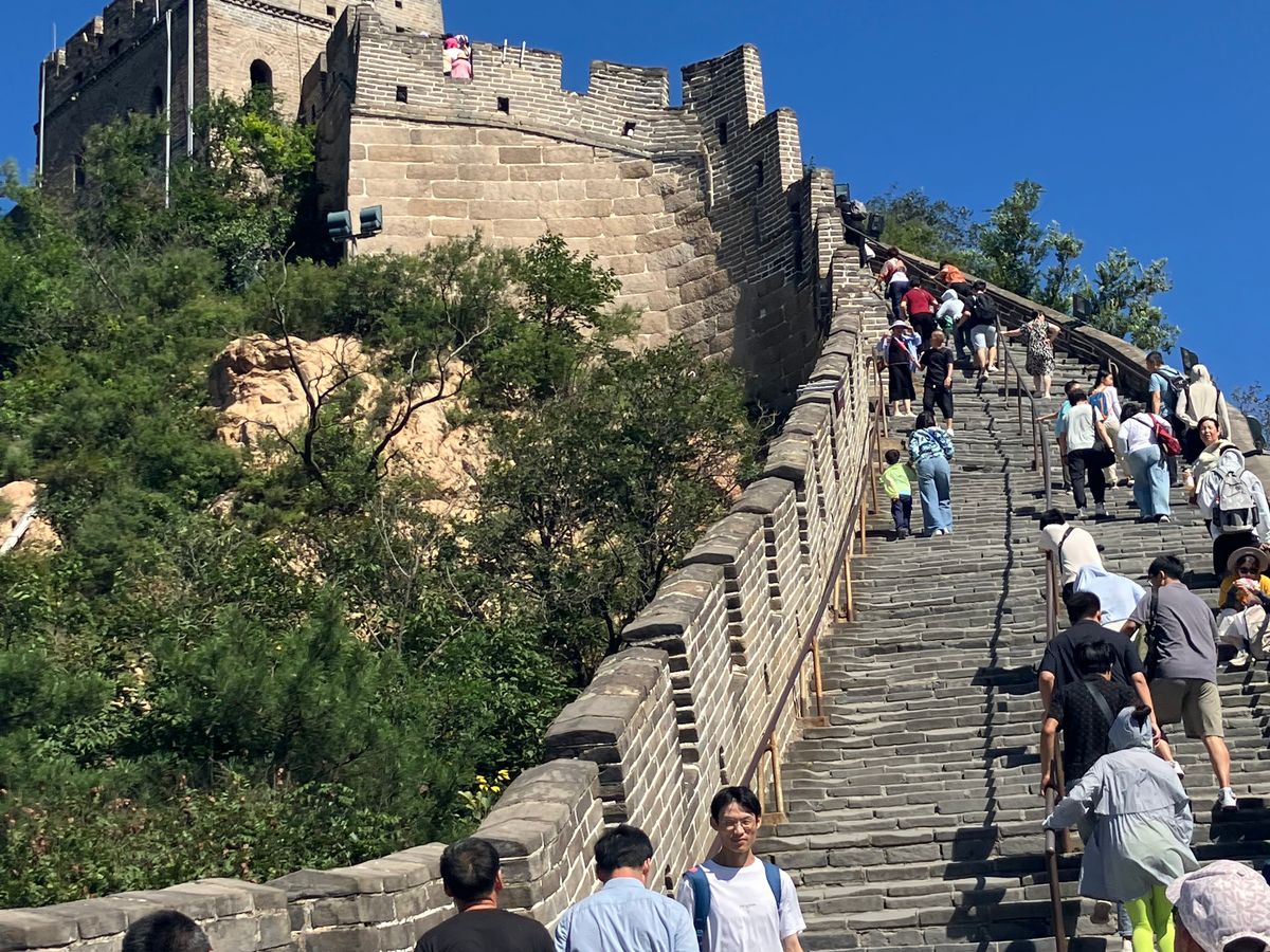 マイクロバスで2家族のツアーでした。入口からすぐの階段がかなりの混雑で注意を要します。女坂の緩やかな方を進みましたが、先に進むほど勾配が急になり、また混雑もひどくなります。北3号楼まで登りましたが天気も良く遠くまで万里の長城が見渡せるため、圧巻の景色でした。また8月で日差しは強いですが風が涼しく心地よかった。帰りは途中で頂上から降りるルートを通ると下りやすいです。ガイドのチョウさんはチケット手配までついてきてくれますが、長城の中にはついてきませんので、自由に観光でき、時間通り出口から出るとチョウさんと予定通り合流できました。
