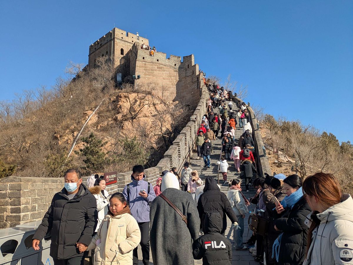 万里の長城は春節明けで空いていたようで、上の方まで登れました。急な斜面では手すりにつかまるように、と注意してくれたのも助かりました。