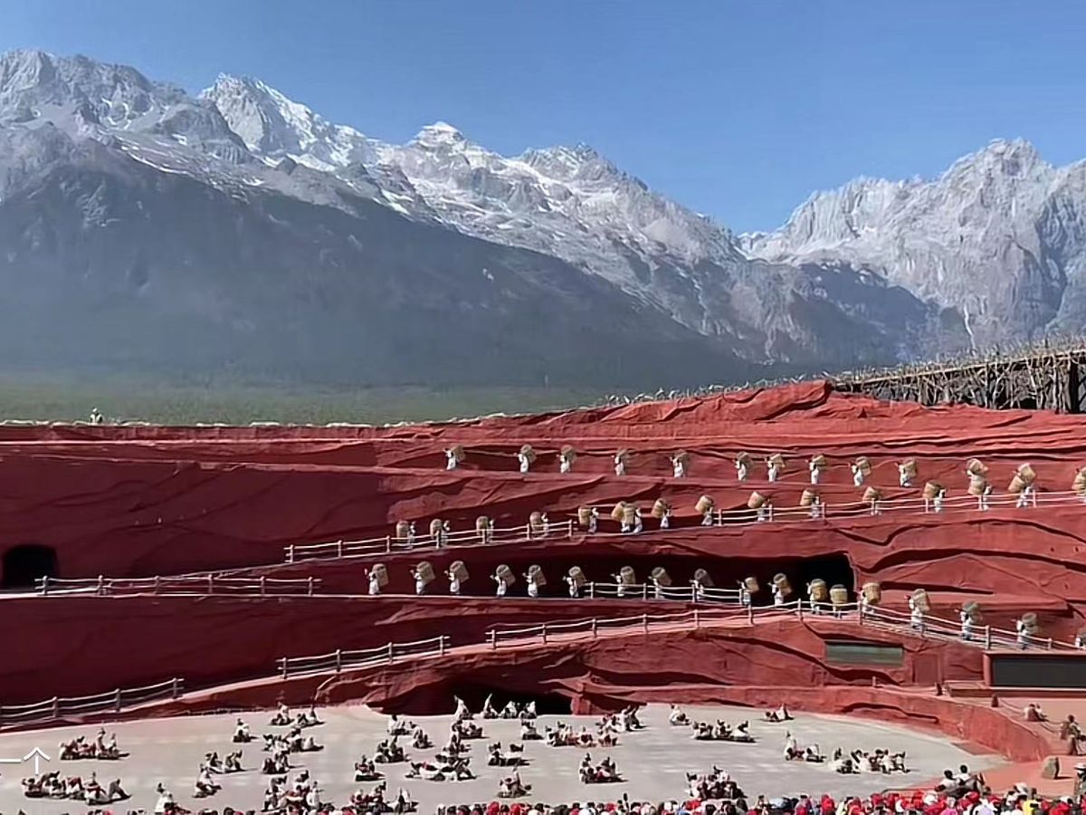 その後、数百人での丽江ショーも晴れていれば、壮大な山々をバックにした壮大なショーだったと思いますが、天気はどうしようもないですね。中国でネットに出ていた写真を添付します。